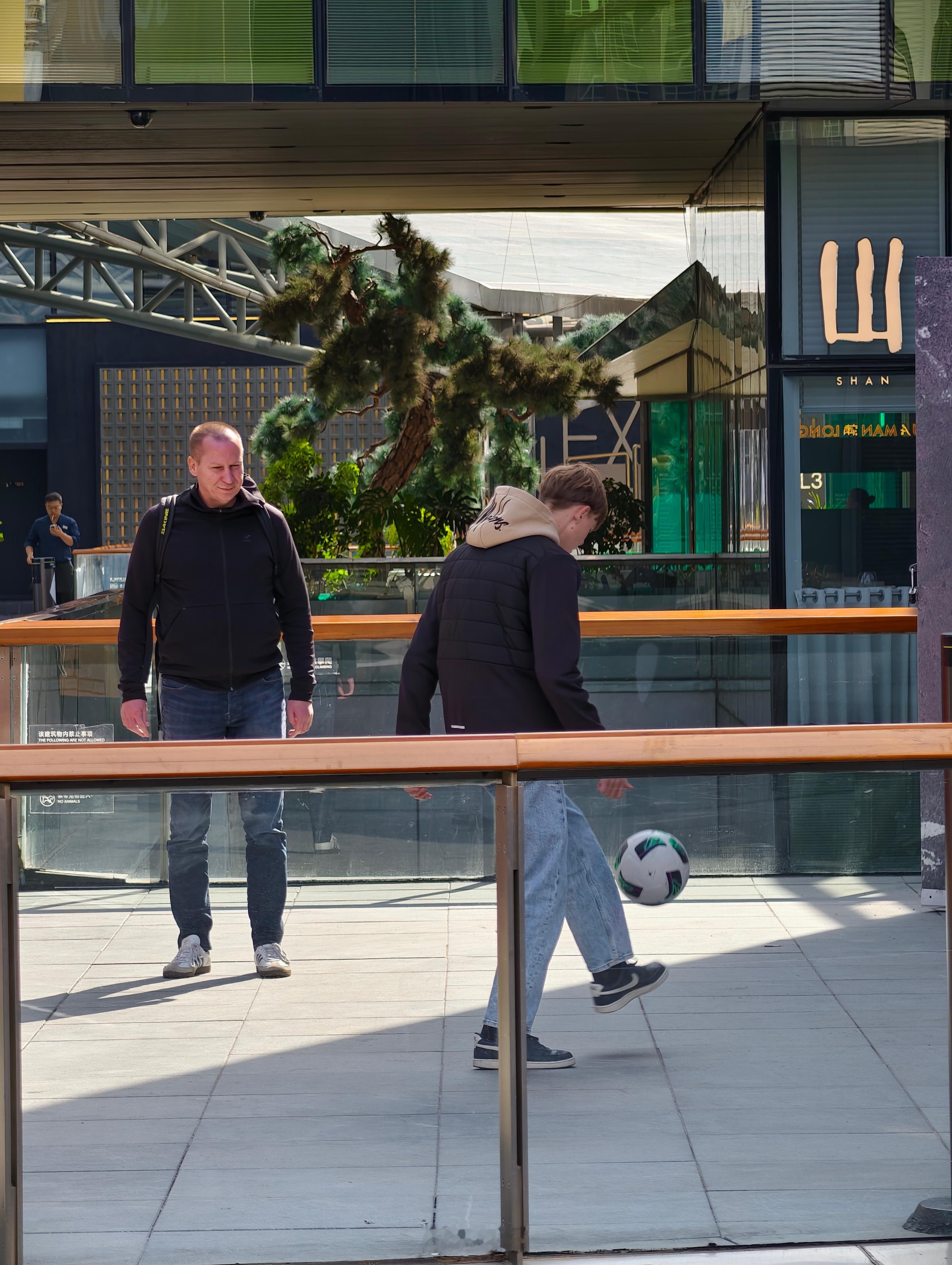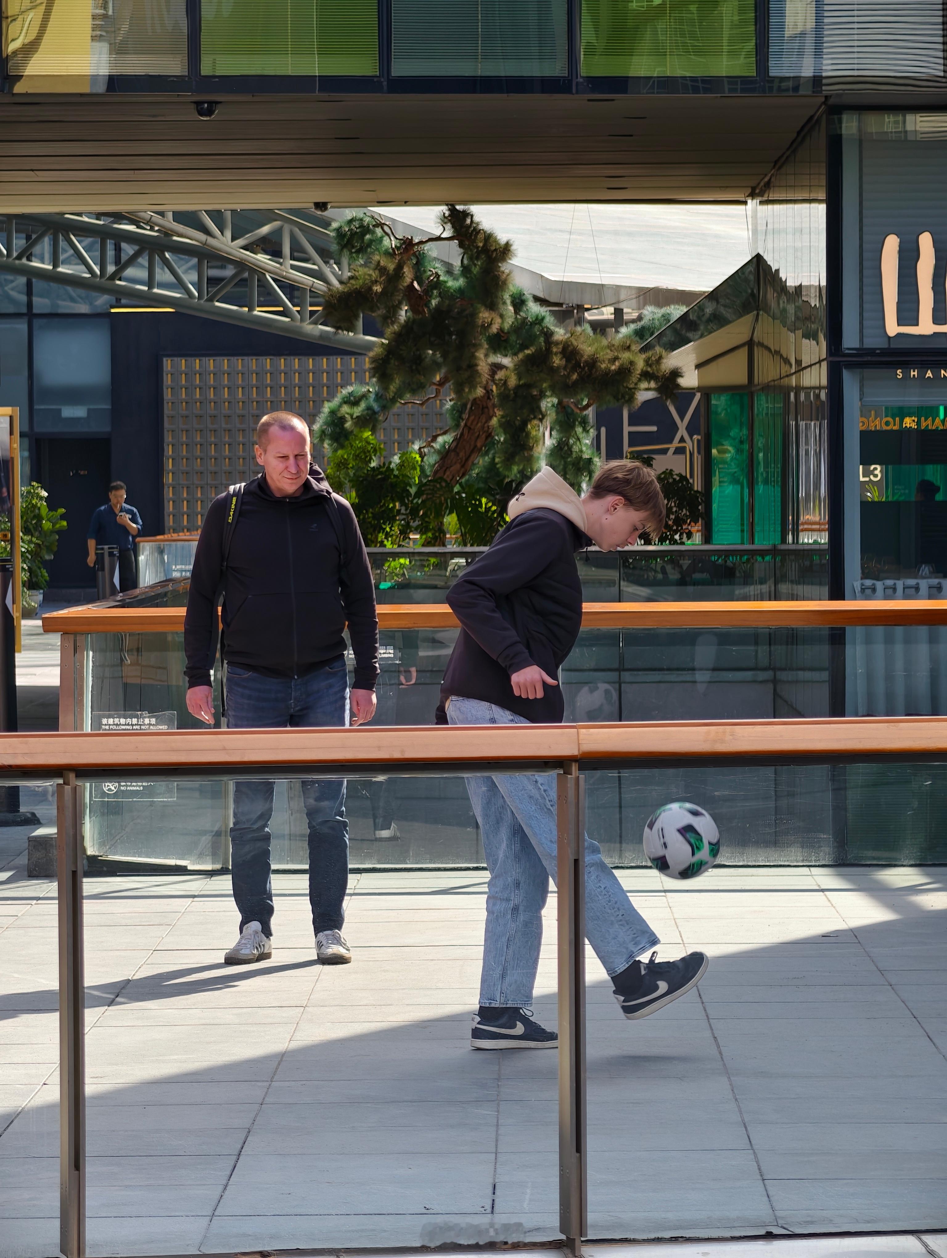 太古里的一个小空地,父子俩兴致勃勃玩起了颠球