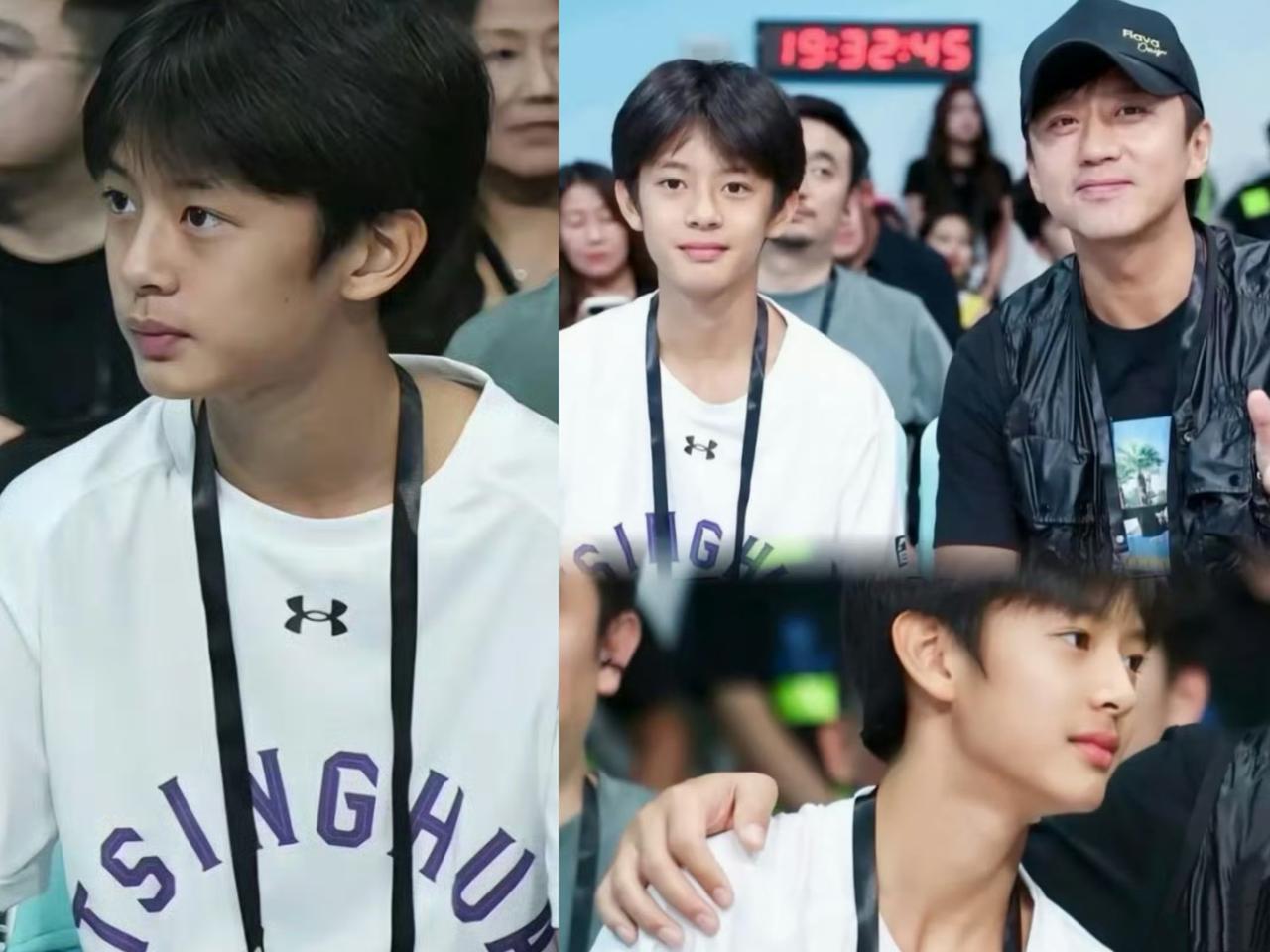 邓超和孙俪在上海体育馆看儿子打篮球比赛,夫妻俩穿着日常服饰,亲自站在场边支持儿子