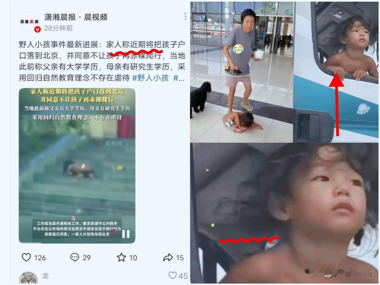 野人小男孩最新后续: 家人称近期将把孩子户口落到北京,并同意不让孩子再赤裸爬行。看图,小男孩的妈妈精神状态有点不对,畏畏缩缩的且眼神呆痴。 孩子妈妈那畏畏缩缩、眼神呆痴的样子,瘦得只剩骨头,哪像个能好好照顾孩子的状态?更让人揪心的是孩子脖子那圈白,网友猜是长期被拴着留下的痕迹,想想都心疼。这哪是什么“自然教育”,分明是拿孩子的童年当实验。 最讽刺的是,这对父母一个大学学历一个研究生学历,却干着连村民都看不过去的事——冬天让孩子光身子跟狗晒太阳,脏了就拎去水龙头冲,劝了两年都不听。现在同意改,怕不是被舆论和调查逼的? 落户读书是第一步,但孩子心里的伤、这个家的问题,哪那么容易解决。你们觉得,后续该怎么盯着才能真的护好这个孩子?野人小孩