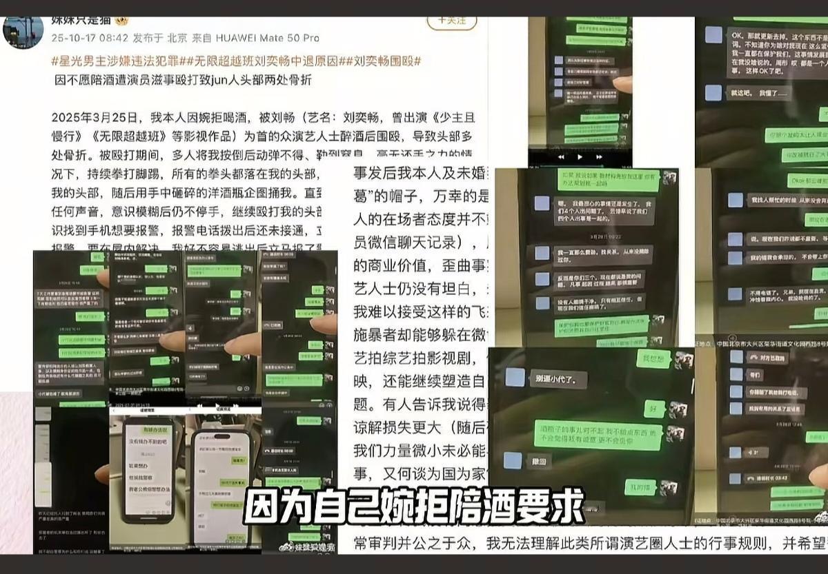 明星身份是光环, 可不是“免罪金牌”! 就因为现役军人梁先生婉拒劝酒,刘奕畅当场翻脸,伙同其他人把人按在地上拳打脚踢,还用洋酒瓶砸头,碎瓶子差点捅上去,直接把人打得两处骨折。 更恶心的是打完还抢手机、锁房间威胁,事后组群串供,说能找关系压下案子,把刑事犯罪当圈子私事处理。 最讽刺的是,这群施暴的还照样拍戏上综艺,新剧都播了,仿佛打人的不是他们。 真当明星光环是免罪符?还好部队介入才戳破他们的关系网,刘奕畅被关进看守所等着审判! 军人保家卫国,尊严不容侵犯,法律更不是摆设。 好在部队调查后还了军人清白,但这也让人深思:明星的特权思维何时能止?若连军人都难自保,普通人又该如何? 你们觉得该让这些人劣迹艺人彻底退出演艺圈吗?军人