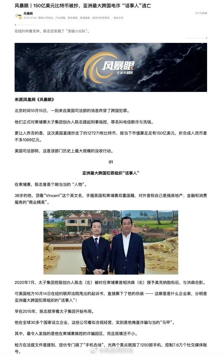 这事儿太震撼了!美国司法部最近抄了柬埔寨一个犯罪集团的老窝,没收了将近13万个比特币,按现在市价算足足150亿美元,创下了他们历史上最大的一次加密货币没收记录。 这个犯罪团伙的头目叫陈志,是个英国和柬埔寨的双国籍人士。他搞了个“太子集团”当幌子,在东南亚开了至少十个诈骗园区。这些地方简直就是监狱,把被骗来的劳工关在里面,没收护照,逼着他们搞“杀猪盘”诈骗。他们手上操控着7万多个社交媒体账号,专门骗全球的受害者。更离谱的是,他们内部还有诈骗教程,连“不要用太漂亮的女性头像”这种细节都写进去了,真是专业干坏事。 这帮人骗到钱后,就把钱换成比特币,以为这样就能神不知鬼不觉地洗白。陈志用这些钱在伦敦买了19处房产,还有私人飞机、名表,甚至买了毕加索的画。但他们没想到,比特币其实是可以追踪的,美国司法部联合专业机构,通过分析区块链数据,硬是找到了他们的钱包,把私钥给拿下了。 这次行动是美国、英国和柬埔寨三国联手干的,配合得相当漂亮。英国那边冻结了陈志的豪宅,柬埔寨也配合调查,直接把他们的资金链给切断了。有意思的是,美国这一抄,他们国家持有的比特币直接从19.8万枚涨到了32.5万枚,增加了将近70%,这无形中加强了他们在加密货币领域的话语权。 现在陈志还在逃,但他的犯罪网络已经被端了。这案子暴露了一个严重问题:虚拟货币正在成为跨国犯罪洗钱的主要工具。数据显示,光是2021到2025年间,涉案的Huione集团就处理了40亿美元的可疑交易。 这件事证明了一个道理:别以为用虚拟货币就能无法无天,区块链不是法外之地。只要你犯了法,再高明的技术手段也保不住你。对那些还在东南亚搞诈骗的团伙来说,这次150亿美元的抄没行动,无疑是一记响亮的警钟。
