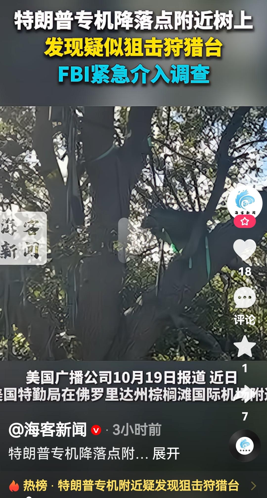 特朗普专机降落地点树上疑似有狙击手 根据美国媒体报道,10月19日在美国佛罗里达州棕榈滩国际机场附近,发现一个狙击手使用的狩猎台,在飞机场附近树上安置着 它的视线可以正好看到美国总统空军一号落地时视野,距离不到200米 美国联邦调查局已经介入,美国总统特朗普的安保已经加强 但是也有人猜测这是附近狩猎者狩猎动物用的 看来特朗普这一任期安保更紧张啊 从竞选特朗普都不太平啊,这一任期还有3年呢,还有1000多天呢,不好把握啊特朗普困局 特朗普外交突袭 特朗普刺杀事件 加州起诉特朗普 图片来自海客新闻视频