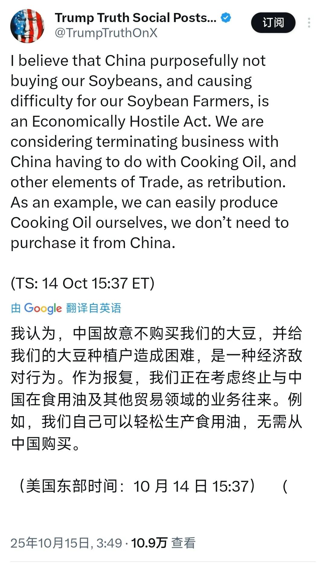 美国总统特朗普今天(10月15日)发文称:“我认为,中国故意不购买我们的大豆,并给我们的大豆种植户造成困难,是一种经济敌对行为。作为报复,我们正在考虑终止与中国在食用品及其他贸易领域的业务往来。例如,我们可以轻松生产食用油,无需从中国购买。” 作为世界头号科技大国,美国完全有能力生产食用油,对此无人质疑,这也是美国内政,其他国家不会干涉。美国大豆丰收,至今无人购买,只能说明美国大豆产能过剩,影响了全球农产品市场稳定,中国不能助长这种歪风邪气,买与不买都是中国内政,美国无权干涉。就像美国纠集盟友对华禁售高端芯片一样,中国自己的稀土产品,如何卖、卖给谁不卖给谁,这是中国的主权,美国同样无权干涉。不至于再出现“八国联军”来华抢劫吧,即使如此也抢不走一克稀土。