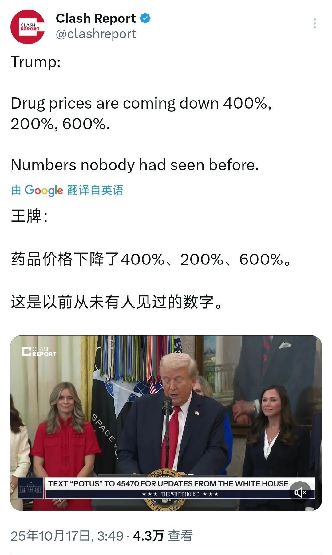 美国总统特朗普今天(10月17日)表示:“美国药品下降了400%、200%、600%。这是以前从未有人见过的数字。” 本次药品降价幅度少了许多,8月3日特朗普接受采访时称,通过加征关税,“我们已经把药品价格降低了1200%、1300%、1400%、1500%,以后仍有下降空间”(图3)。美媒质疑称,将药品价格降低100%意味着免费,超此标准则表示制药或药品销售公司向买药人发钱。对于特朗普今天的表态,美国媒体末提出质疑,毕竟特朗普此举有利于美国社会稳定,“零元购”就此消失,低收入群体排队买药即可。
