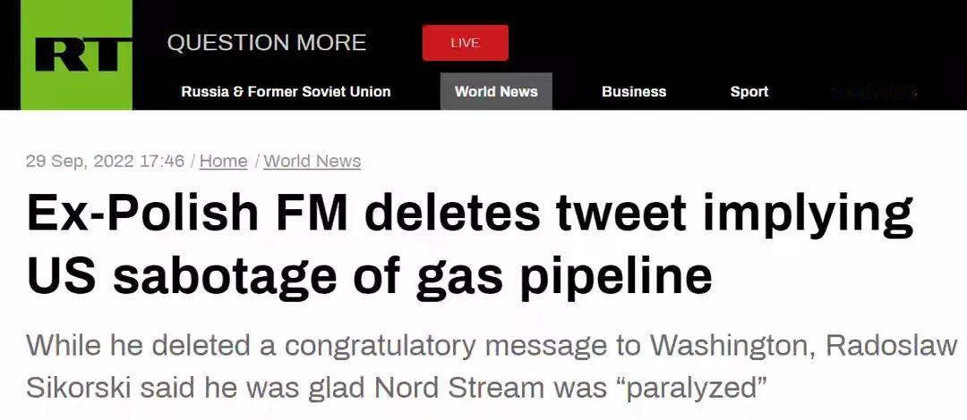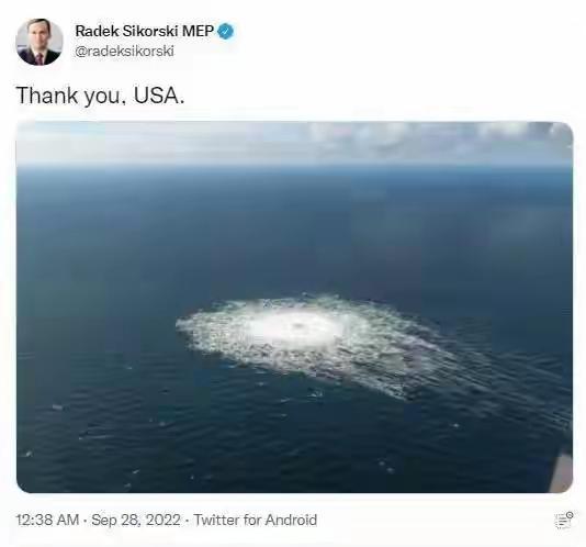 多家外媒昨天(10月18日)报道:“波兰华沙地区法院拒绝将涉嫌参与‘北溪’天然气管道爆作事件的乌克兰籍男子引渡至德国,并撤销针对他的临时拘留措施,裁定立即释放他。” 2022年9月27日,俄罗斯与德国共建的“北溪”天然气管道被炸后,波兰前外长又是现任外长的西科尔斯基当即发推文称“谢谢你,美国!”(图4)。对于嫌疑人被释放,西科尔斯基认为,“当外国侵略者轰炸你的国家时,通过破坏为战争提供资金的基础设施,这完全是合法的”。波兰总理图斯克则表示,“华沙不会引渡这名涉嫌参与北溪管线爆炸的乌克兰人到德国,俄罗斯和德国共同建设的天然气管线才是主要问题”。从因果关系上,图斯克认为没有该管线就不会有后面的犯罪嫌疑人,不知德国作何感想?