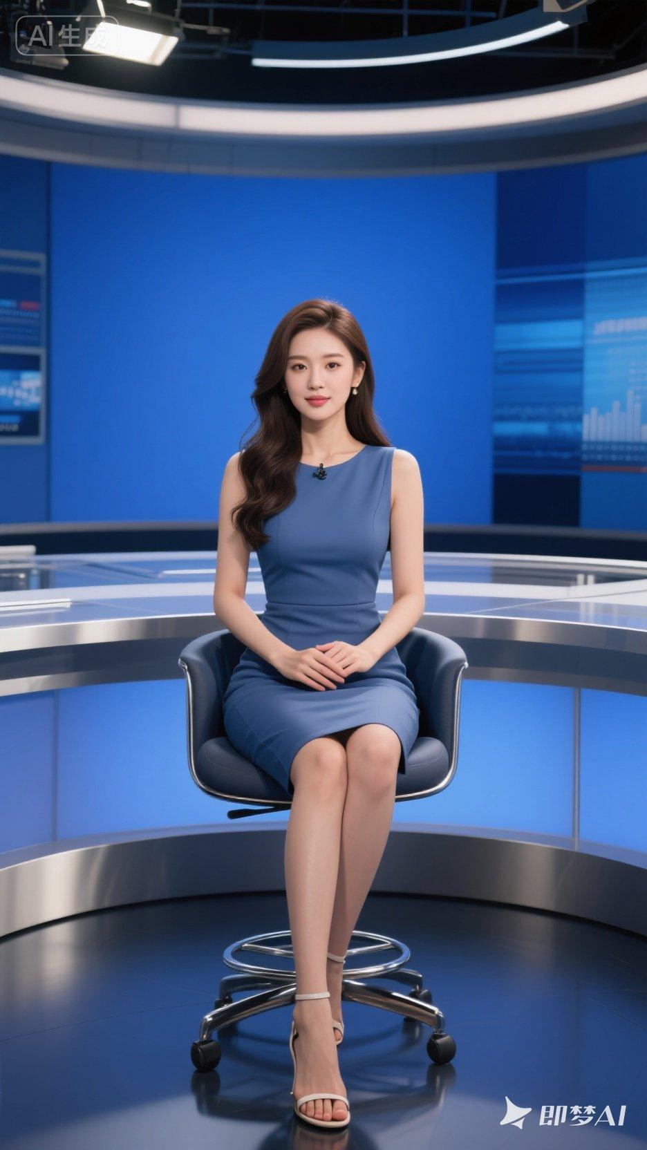 优雅主播坐镇新闻台,蓝色裙装尽显专业风范!💃📺
