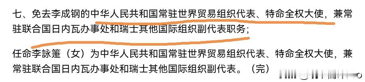 李成钢得到进一步重用!我们国家对李成钢的职务进行调整!10月20日,根据国内媒体报道,我们国家对李成钢的职务进行调整。我们国家决定免去李成钢的中华人民共和国常驻世界贸易组织代表、特命全权大使,兼常驻联合国日内瓦办事处和瑞士其他国际组织副代表职务。 而在免去李成钢这一职务之后,现在李成钢的职务为中国商务部党组副书记、国际贸易谈判代表(正部长级)兼副部长 。很显然,免去了副部长级别的常驻世界贸易组织代表等职务,这意味着什么呢?这意味着李成钢工作的重心将更加转向国际贸易谈判代表,也就是更加聚焦于当下的中美经贸谈判,而无须为其它事宜分心。 此前,美国财长贝森特出言不逊声称,中方一个“级别较低”的官员“无礼”,甚至称其为“精神失常”“狼战士”,行为异常等等。而现在李成钢工作更加聚焦于中美谈判,这对于美国,尤其是对于美国财长贝森特而言,这肯定是一个非常不好的消息。因为,这意味着贝森特不得不与他本人感到头疼的中方代表打交道,而我们也乐见李成钢副部长在谈判桌上捍卫我们国家的利益。