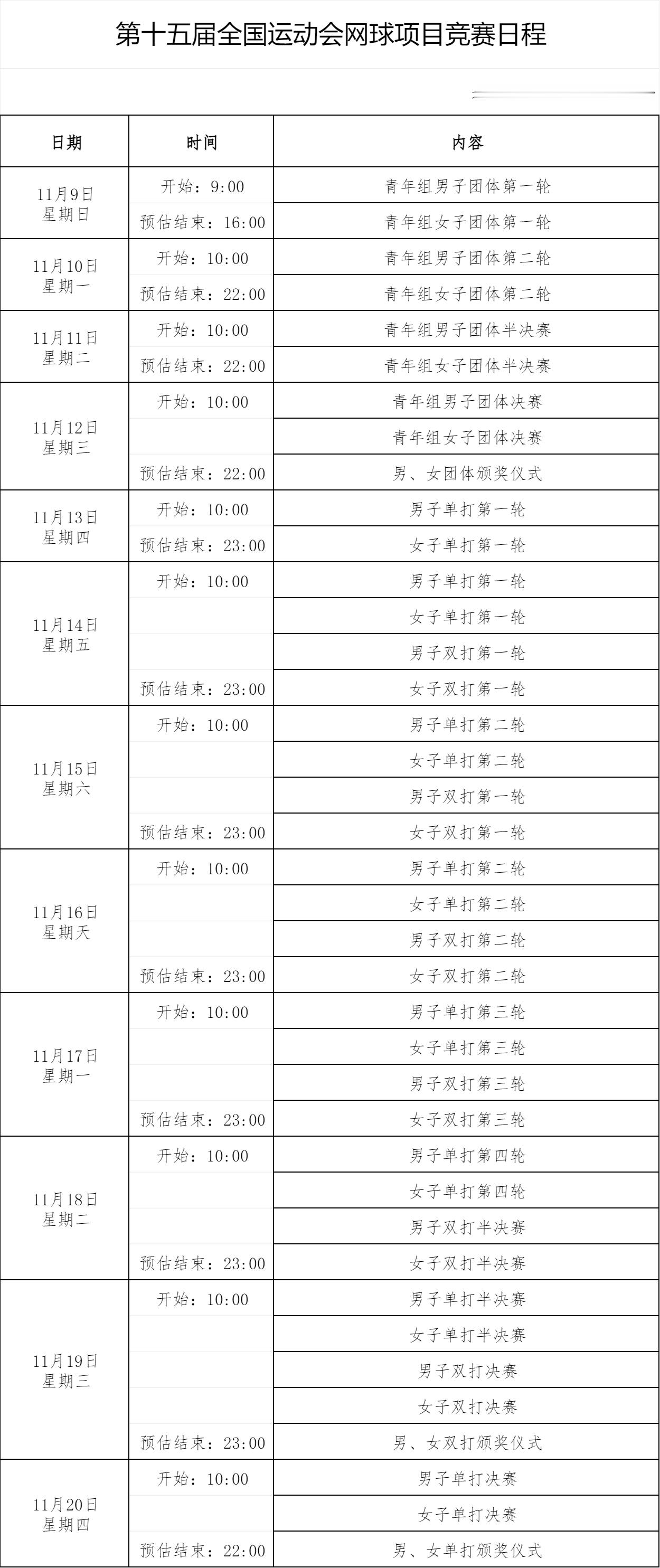 今年全运会网球项目赛程如图🎾(11.9-11.20)