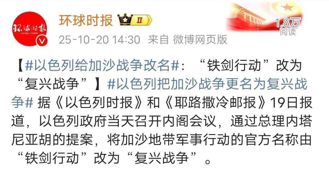我就说嘛,只要哈巴斯将手中的以色列人质全中释放,以色列也就彻底没有了后顾之忧,加沙也就完全失去了所有安全屏障。用不了多久,以色列就会卷土重来。 凭一纸停火协议就会换来和平,未免过于天真。尤其进敌人明显比你强大得多,他凭什么要和你谈和平?如果他的最终目的只是为了与你和平共处,当初他发动侵略战争又是为什么呢?难道是他吃饱了撑的? 以色列内阁已经通过了内塔尼亚胡的提案,将在加沙地带军事行动的官方名称由“铁剑行动”改为“复兴战争”。 目前停火的只是“铁剑行动”,和“复兴战争”没有任何关系。名字一改,就不违反停火协议了。