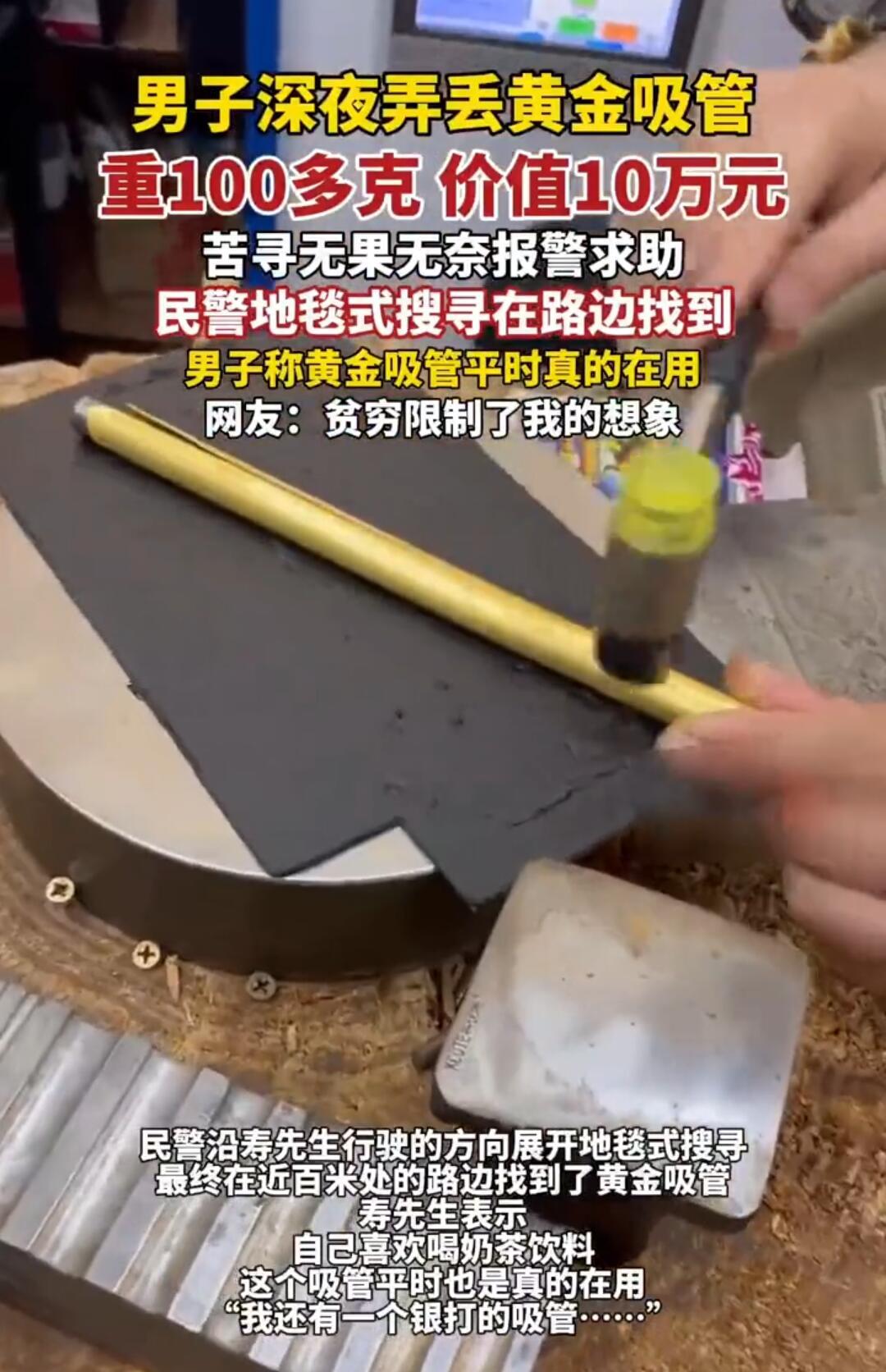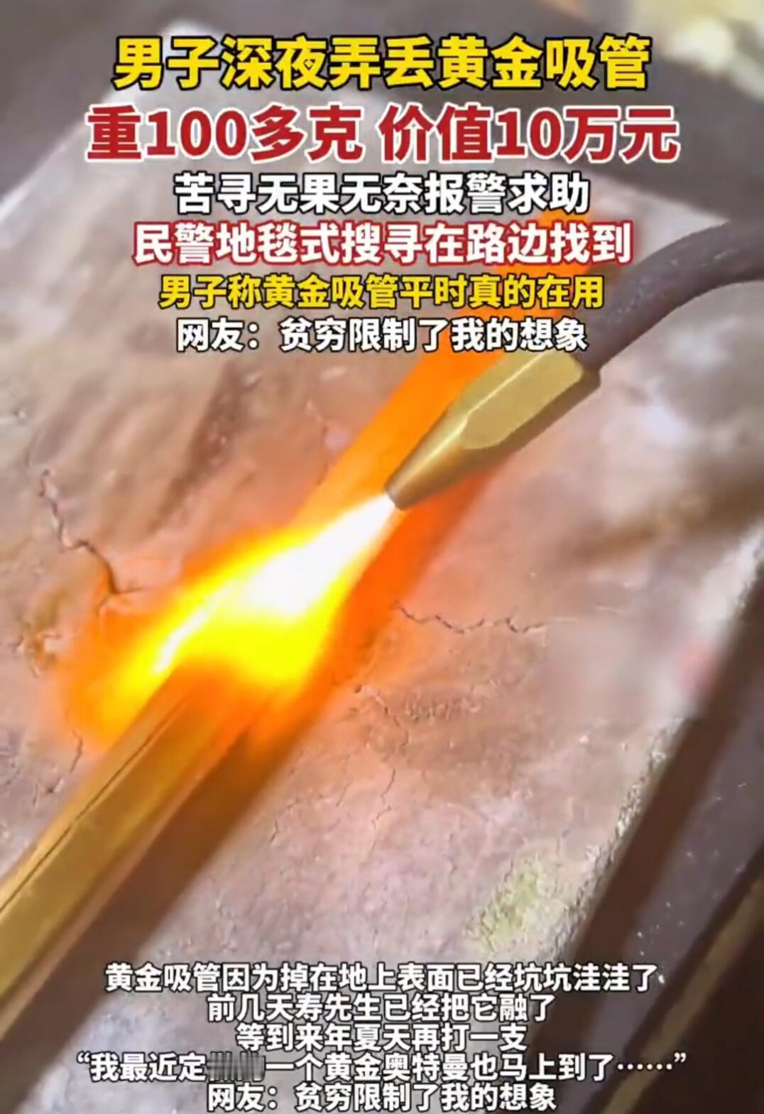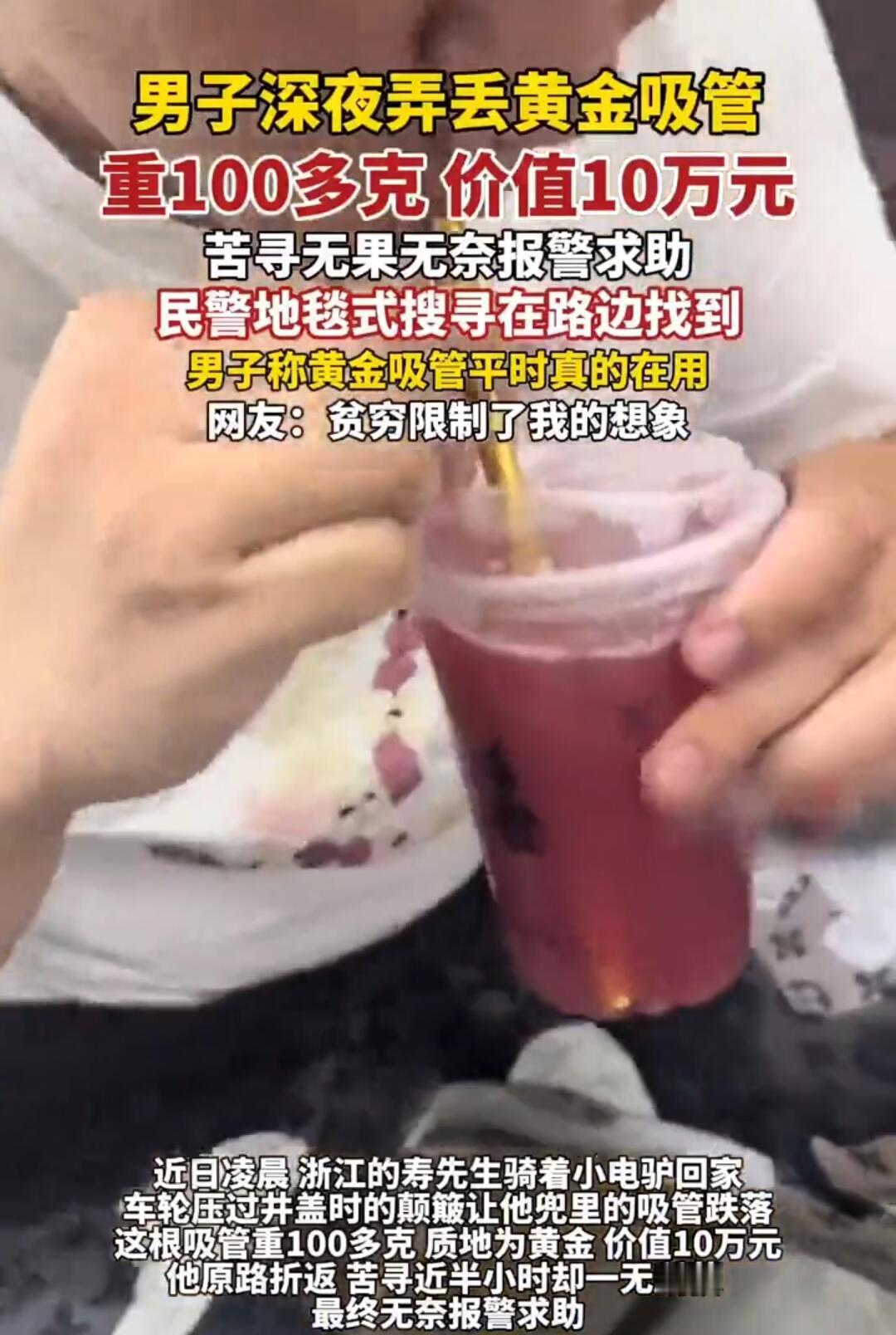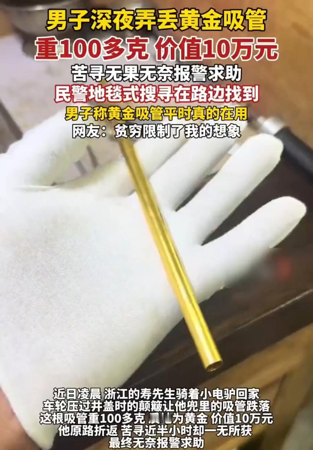 10万块的黄金吸管,你见过吗?浙江的寿先生就有一根,平时喝奶茶、饮料都用它,随手揣兜里,结果某天凌晨骑电动车经过井盖时颠了一下,发现吸管不见了。 这可不是普通吸管,100多克纯金打造,按市价值10万块。寿先生沿路找了半小时没找到,只能报警。民警赶到后和他一起地毯式搜寻,20多分钟后在路边草丛里发现了那根已磕得坑坑洼洼的黄金吸管。 寿先生说,家里还有根银吸管,用着比塑料的舒服。更让人惊讶的是,他已经把这根磕坏的金吸管融了,打算明年夏天再重新打一根。他还定做了一个黄金奥特曼,准备给孩子玩。 网友们纷纷表示:"贫穷限制了我的想象力""原来真有人把黄金当日用品""建议配个小布袋装吸管"。也有人好奇:"黄金吸管喝奶茶会变甜吗?" 我觉得吧,有钱人的世界咱不懂,但把黄金当日常用品确实奢侈。不过从环保角度看,金吸管确实比一次性塑料吸管好得多。你怎么看这种奢侈又环保的生活方式?