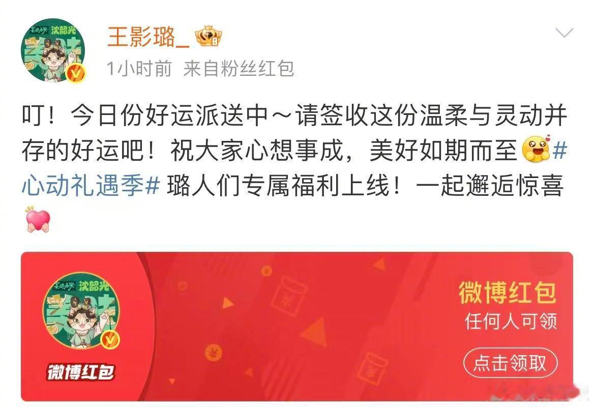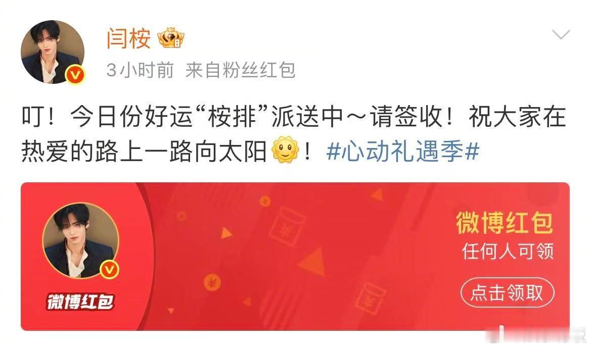 被喜欢的明星发红包了 谁懂啊!礼遇季直接开启“明星红包雨”模式也太惊喜了吧!王道铁、闫桉、孔雪儿这些帅哥美女也太大方,光是想想能收到他们发的红包就忍不住期待,现在满脑子都是蹲红包的姿势,手已经准备好啦~