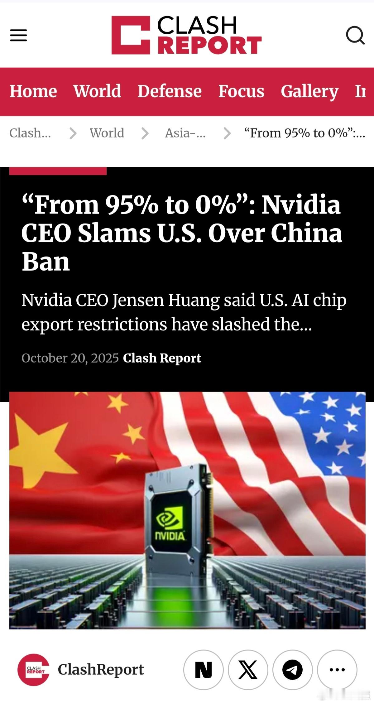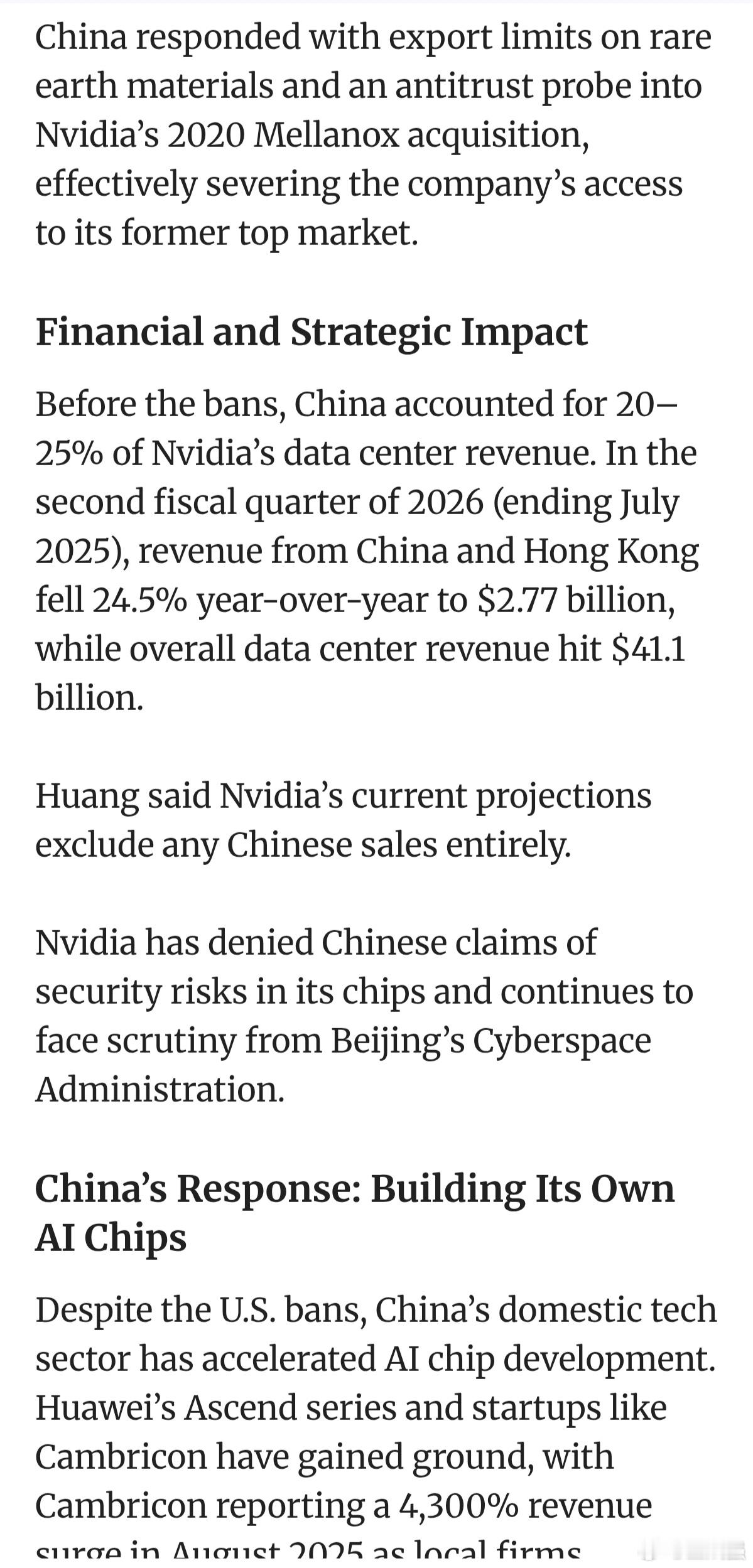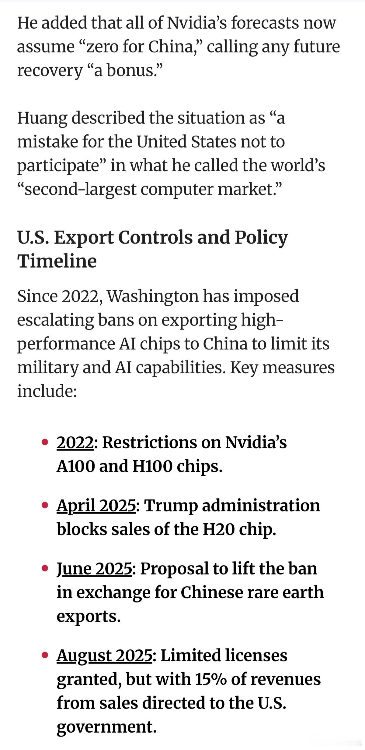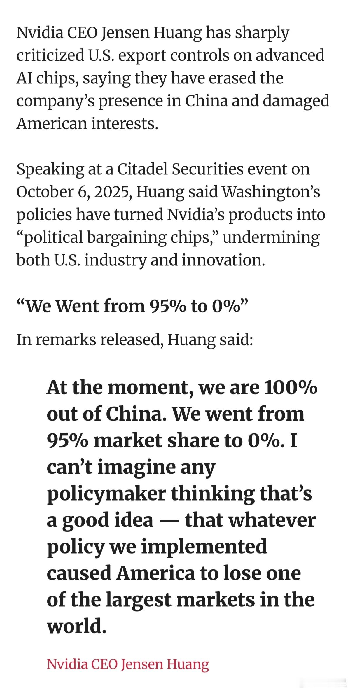 英伟达首席执行官黄仁勋猛烈抨击美国对华人工智能芯片出口禁令,称其抹去了英伟达的市场份额——“从 95% 降至 0%”。