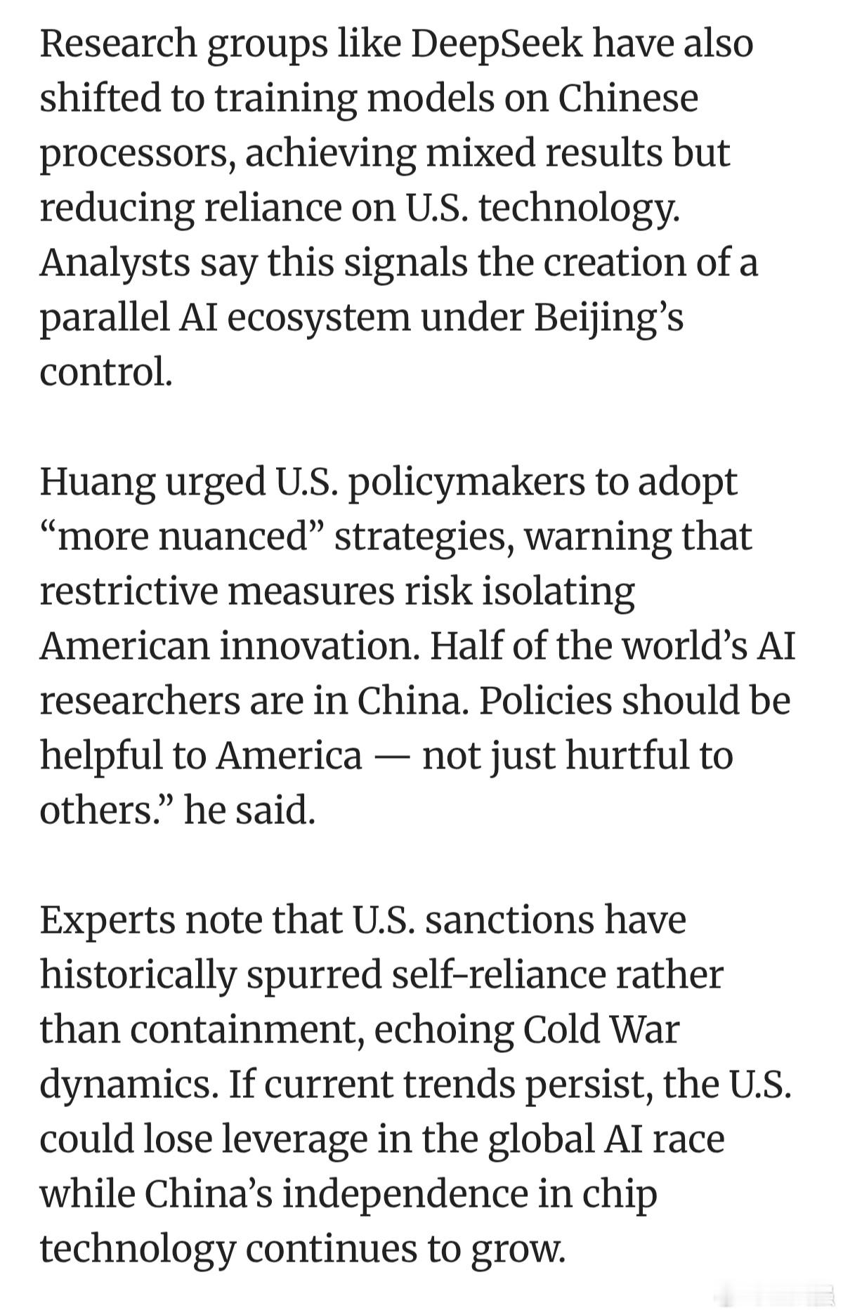 黄认为,这项政策对美国公司的伤害大于对中国进步的限制。
