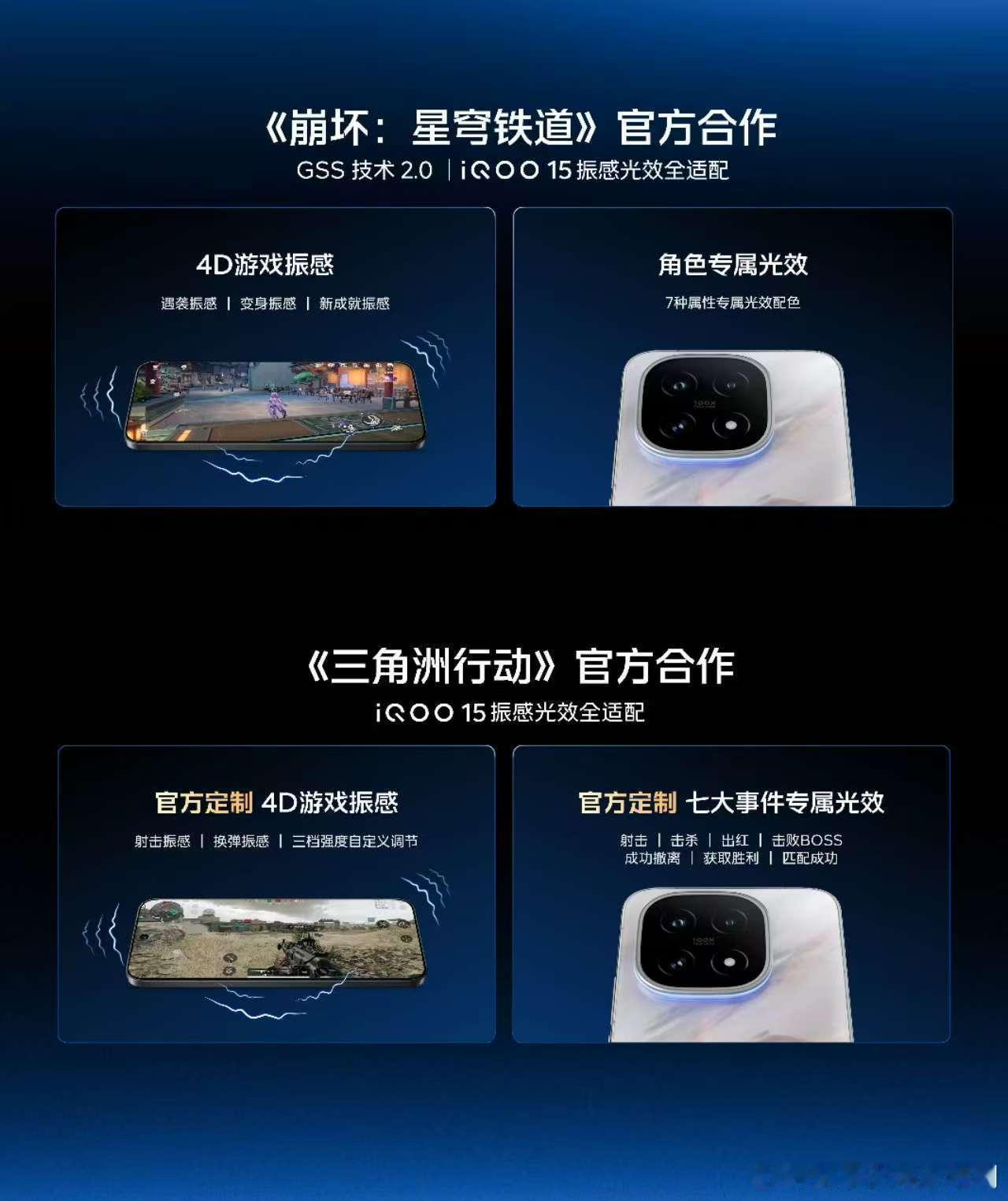 聊聊性能吧,iQOO15 搭载第五代骁龙8至尊版,最新3nm制程工艺,2+6全大核设计,首发独立高速显存和Game Ready手游驱动并全面落地《永劫无间》手游,《崩坏:星穹铁道》实装独立高速显存,首发《暗区突围》120帧档位全地图光追。配备速率高达9600Mbps的LPDDR 5X Ultra和最新的UFS 4.1,安兔兔综合跑分高达438W+。