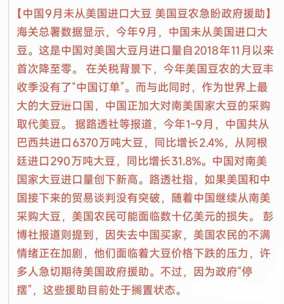 关税战之后,美国大豆遭遇滞销困境,大量大豆只能烂在地里,农民苦不堪言。如今,美国农民协会彻底放弃对政府的期待,选择主动自救——他们迫切希望能直接与中国谈判。