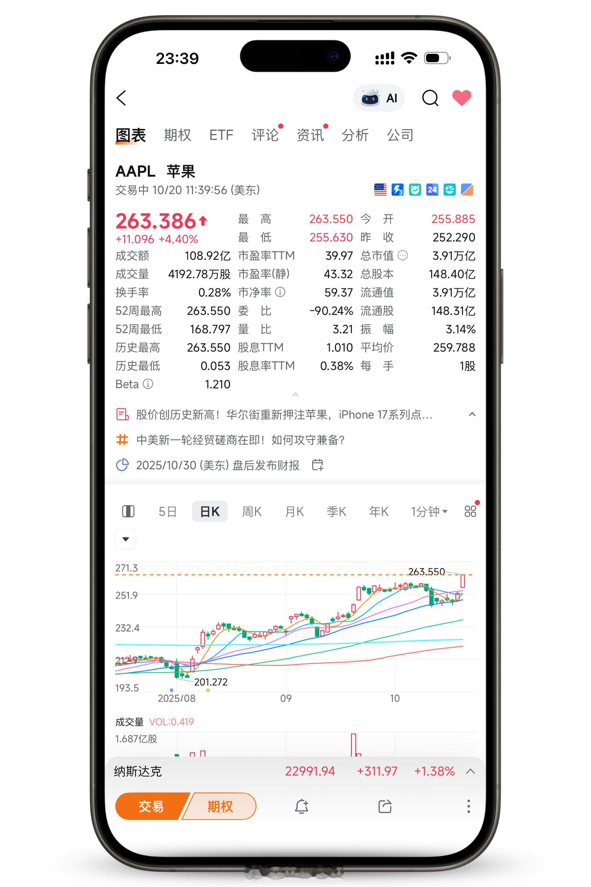 苹果市值 3.91 万亿了,即将逼近 4 万亿大关。