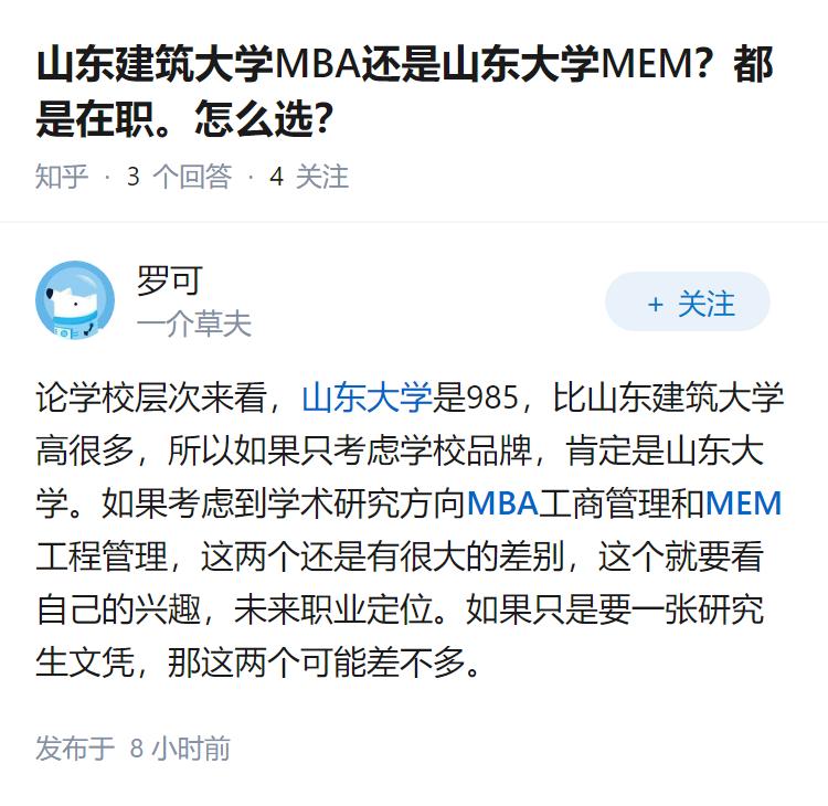 山东建筑大学MBA还是山东大学MEM?都是在职。怎么选?