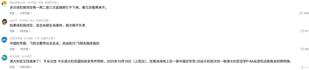 “有力反制!” 字正腔圆,孔武有力!…… 不知道袋鼠国看不看得懂中文。 南海那边又闹腾起来了, 澳大利亚一架P-8A侦察机偷偷溜进咱们西沙群岛的上空, 离海面最近的地方就6公里多点, 搁谁家地盘上这不是明摆着找事儿吗? 咱们解放军战机直接起飞, 直接把它撵出去了。 这次发言人话说得可直白:“依法办事,盯紧了,赶走了。” 这回还特意用了“有力反制”四个字, 这一看这词平时可不常见。 意思就是咱们不是闹着玩的,澳方得长点心眼儿,别老想着占便宜。 澳洲这几年老爱在南海转悠, 背后有啥心思大家心知肚明, 但我的地盘我做主,规矩得由我们自己来定。 这次警告是为了防意外, 下回要是再来,歼-20可能就得现身了。