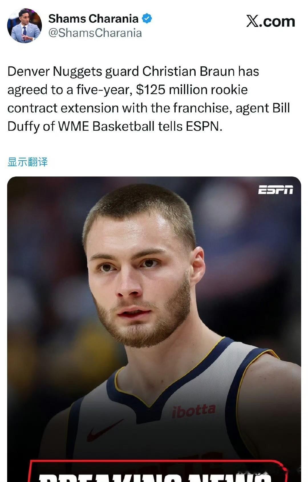 掘金疯了!!!布劳恩5年1.25亿美元续约掘金! 根据记者Shams最新消息透露,掘金后卫布劳恩也在这一天完成了提前续约,他最终和掘金队达成了一份5年1.25亿美元的签约。 这个价格怎么说呢,也算是中规中矩,一般般吧,可能和刚刚续约的丹尼尔斯合同薪资差不多,基本上有些3D属性的在2500万左右已经成为联盟中的一个共识了。 不过布劳恩和丹尼尔斯还是不同类型的球员,在两支球队的作用也不同,掘金正在进行新老球员的衔接,他们培养了布劳恩,不舍得的放弃他。 不过在丹佛这样的小城市,这个价格也算了可以了,从目前整个联盟的情况来看,这笔签约还是值得的,毕竟未来联盟的信息越来越高。 恭喜掘金,恭喜布劳恩,小伙子表现不错,继续加油!