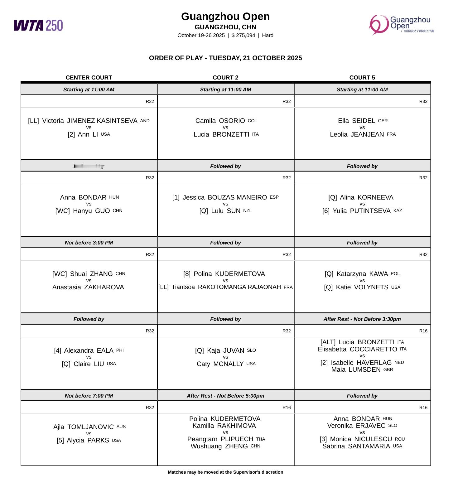 广州站张帅、郭涵煜出战首轮,伊埃拉、安·李、博萨斯·马内罗亮相。东京站施耐德、肯宁登场,费尔南德斯迎战萨卡里,姆博科对阵安德莱斯库。