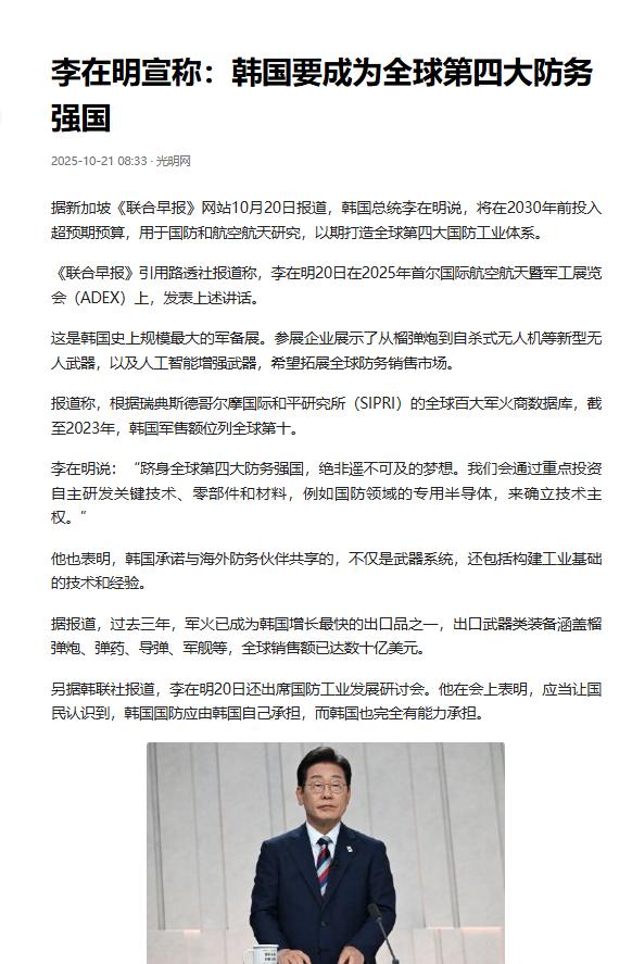 不要美军,韩国下决心了。 当地时间20日,李在明在出席国防工业发展研讨会时表示:即便在当前形势下仍有部分国民认为,韩国国防必须依赖外部力量,这一点难以认同。 早从 1953 年朝鲜战争停战起,韩国就把军队指挥权交给了 “联合国军司令部”,相当于把自家安全的钥匙递到了美国手里,即便 1994 年收回平时指挥权,战时指挥权却像块烫手山芋,从 2012 年推到 2015 年,再延到 2020 年,每次推迟都透着对自身实力的不自信。 但现在不一样了,李在明敢说 “有能力承担”,底气首先来自国防工业的爆发式增长。 根据瑞典斯德哥尔摩国际和平研究所的数据,截至 2023 年韩国军售额已排到全球第十,而过去三年军火更是成了韩国增长最快的出口品之一,榴弹炮、导弹、军舰这些 “硬家伙” 一年能卖几十亿美元。 就在李在明表态的同一天,首尔国际航空航天暨军工展览会上,韩国企业亮出了从自杀式无人机到人工智能增强武器的全套装备,这场史上最大规模的军备展,与其说是展示成果,不如说是给 “自主国防” 打广告。 李在明甚至放话要在 2030 年前砸超预期预算搞研发,目标直指全球第四大防务强国,还特意提到要攻克国防专用半导体这类核心部件,摆明了要摆脱对外部技术的依赖,毕竟光买武器算不上真自主,掌握造武器的根技术才是关键。 更现实的原因是驻韩美军这颗 “吞金兽” 带来的压力。 驻韩美军常年保持 2.85 万人的规模,光基地年耗资就达 50 亿美元,这笔钱大部分要韩国买单,可花了钱却落不着实权 —— 美军第七航空队的两个战斗机联队、第八军第二步兵师这些精锐力量,指挥权一直攥在美国手里,韩国连联合军演的主导权都没有。 这种 “花钱请保镖却要看保镖脸色” 的日子,韩国早就想结束了。 之前文在寅政府就想提前收回战时指挥权,只是当时实力不够没成,现在不一样了,韩国自己能造 K2 坦克、KF-21 战斗机,连驱逐舰都能批量下水,武器国产化率逐年攀升,自然没必要再捧着金饭碗讨饭吃。 国民的态度更是给了李在明底气。 韩媒刚做的调查显示,六成以上韩国民众同意本国拥有核武器,而觉得安保状况 “非常不安” 的比例从三个月前的 29.5% 飙升到 52.9%,这种安全感缺失反而倒逼大家认同 “靠人不如靠己”。 盖洛普民调更能说明问题,45% 的韩国人支持在中美间保持平衡,主张亲美的只有 28%,这意味着 “摆脱美国依赖” 不再是少数政客的口号,而是有广泛民意基础的选择。 李在明自己的支持率虽然回落至 45%,但仍领先对手 9 个百分点,这其中 “自主国防” 的主张显然帮了不少忙,毕竟没有哪个选民愿意支持一个让国家继续看别人脸色的领导人。 从历史脉络看,韩国对美军的依赖本就是特殊时期的权宜之计,冷战结束后反对美国驻军的声浪就没断过,只是以前没实力硬气。 现在不一样了,一边是每年花 50 亿美元养着 “外人” 却没话语权,一边是自己的军火能卖向全球、核心技术不断突破,换谁都会算这笔账。 李在明说 “韩国有能力承担国防”,可不是嘴硬,看看韩国军工企业的扩张速度就知道,他们已经不满足于自保,还要当 “军火玩家”,这种情况下自然要逐步把美军的角色边缘化。 未来不缴驻军费、要求美军缩减规模甚至撤离,不过是水到渠成的事,毕竟当自己能扛枪打仗时,谁还愿意花钱请个 “太上皇” 在身边呢?