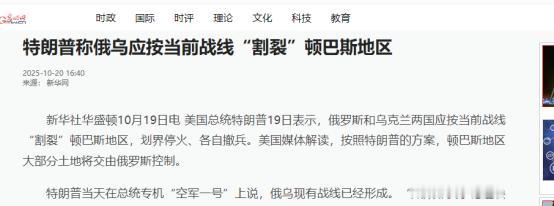 【特朗普:乌克兰领土已经分割完毕,78%的领土已经被俄罗斯攻占,维持现状就好】 10月20日,特朗普指出,俄罗斯和乌克兰军队应在当前战线停火,以便后续就相关事宜进行谈判。他补充称,并未与泽连斯基讨论将顿巴斯割让给俄罗斯的问题。 特朗普这话说得轻巧,“维持现状就好”,可乌克兰的领土问题哪有这么简单?10月20日他在白宫表态,要求俄乌按当前战线停火,还强调没和泽连斯基讨论过割让顿巴斯。但稍微懂点局势的人都知道,这背后的博弈早就白热化了。 先说说特朗普嘴里的“78%领土被俄罗斯攻占”,这个数据主要来自顿涅茨克和卢甘斯克两个州的实际控制情况。 根据战场最新动态,卢甘斯克州已经被俄军控制了99.4%,顿涅茨克州也有74%在俄方手里。这两州加起来,确实能算出个78%的比例。但问题在于,顿巴斯地区的争夺从来不是简单的数字游戏。 乌克兰在这俩州还有不少据点,比如顿涅茨克市周边,乌军还在顽强抵抗。特朗普说“维持现状”,等于变相承认俄罗斯对这些土地的占领,这让乌克兰怎么咽得下这口气? 更有意思的是特朗普的谈判逻辑,他主张停火后再协商,可停火本身就意味着承认现有控制线。乌克兰总统泽连斯基虽然被逼到墙角,但依然咬死“不割让领土”的底线。双方在白宫会谈时,泽连斯基团队甚至被特朗普的强硬态度气到拂袖而去。 这种情况下,所谓的“后续协商”大概率是一纸空文。俄罗斯早就把乌东四州写入宪法,根本不可能吐出来。特朗普的方案,说白了就是让乌克兰接受“战败国”待遇,这搁谁能答应? 再看看国际社会的反应,北约虽然没直接出兵,但通过“乌克兰协议”给乌提供长期军事支持,包括武器、训练和情报共享。英国更绝,直接签了个百年协议,承诺“只要有需要就一直军援”,甚至考虑在乌克兰部署军事基地。这哪是停火,分明是给乌克兰套上了“西方军事托管”的枷锁。俄罗斯本来想阻止北约东扩,结果乌克兰成了西方的“准成员国”,家门口的威胁比战前还大。普京要是早知道会这样,估计肠子都悔青了。 经济账也得好好算一算,俄罗斯为了这场战争,军费开支像坐火箭一样飙升。2025年国防预算高达13.5万亿卢布,占GDP的6.7%,已经快赶上苏联解体前的水平了。虽然军工产业占比从3%涨到10%,但民用制造业萎缩了12%,超市里全是中国替代品,面包牛奶价格两年涨了40%,老百姓苦不堪言。 反观乌克兰,虽然GDP暴跌,但有西方输血,2025年上半年光美国就给了66亿美元援助。更讽刺的是,俄罗斯控制的乌东地区,很多基础设施都被战火摧毁,重建成本比打仗还高。特朗普说“维持现状就好”,可这现状背后是两国经济的千疮百孔。 最打脸的还是特朗普自己的立场变化,今年早些时候他还施压乌克兰“以领土换和平”,9月又突然宣称乌能“夺回整个乌克兰”,现在又回到“维持现状”。这种反复无常的态度,让国际社会对美国的信任度大打折扣。连乌克兰都抱怨,美国的援助像“挤牙膏”,想要的ATACMS导弹至今没到手。 反观俄罗斯,虽然被制裁得很惨,但通过“东向战略”和中国、印度等国加强合作,2025年上半年GDP居然还增长了1.2%。这脸打得,特朗普估计自己都疼。 现在的局势就像一场没有裁判的拳击赛,双方都打得鼻青脸肿,却没人愿意先放下拳头。特朗普的“维持现状”方案,本质上是想快速止损,好腾出手来处理国内烂摊子。 但乌克兰不答应,俄罗斯更不可能配合。北约的东扩威胁依然存在,欧盟内部也开始出现“援乌疲劳”的声音。这场战争的结局,恐怕远不是特朗普一句话就能定下来的。 来源:光明网 【特朗普称俄乌应按当前战线“割裂”顿巴斯地区】