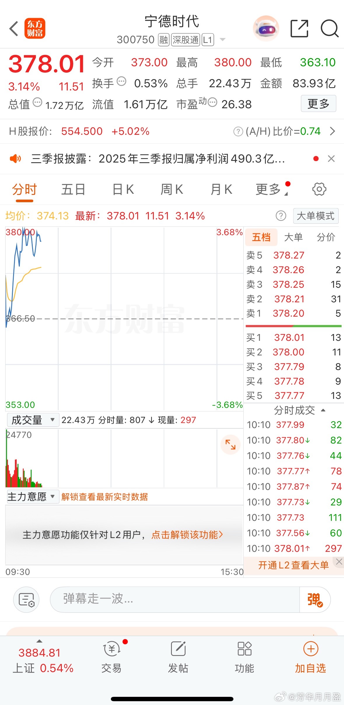宁德时代公告前三季度营业总收入为2830.72亿元,同比增长率9.28%;净利润为490.34亿元,同比增长率36.20%。