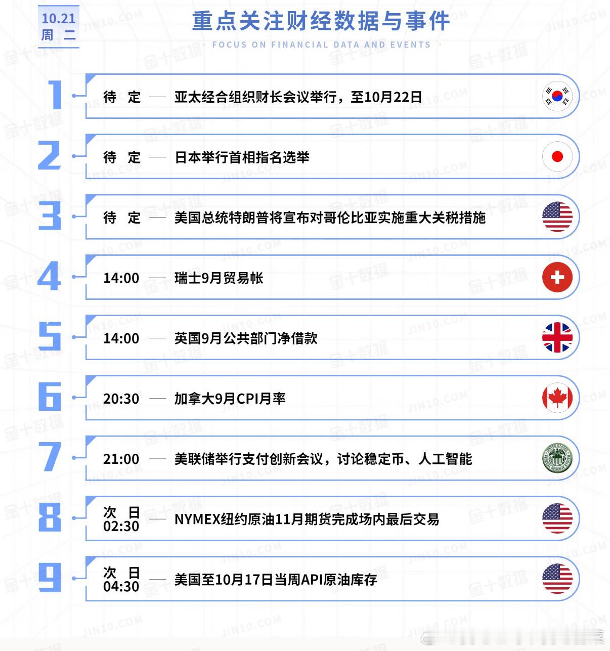 【今日重点关注的财经数据与事件:2025年10月21日周二】①待定亚太经合