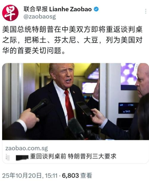 外媒10月20日报道:“美国总统特朗普在中美双方即将重返谈判桌之际,把稀土、芬太尼、大豆,列为美国对华的首要关切问题。” 很明显这三个"痛点"一曝光,美国在关键领域的被动处境彻底藏不住了。 先说稀土,美国87%的武器系统零部件依赖中国稀土供应,F-35战机每架需要417公斤稀土,弗吉尼亚级核潜艇更是要消耗4.2吨。 中国10月9日出台新规,不仅扩大稀土材料管制范围,还创造性地引入"境外特定出口经营者"概念,规定含有0.1%以上中国稀土的外国产品出口也要审批。 这招直接戳中美国要害——美国本土仅有一座稀土矿投产,且中重稀土提炼能力几乎为零,加州帕斯山矿挖出的矿石80%还得送中国提纯。 特朗普要求中国放松管制,可中国商务部明确表示,稀土管制是主权行为,美国军工企业要想稳定拿货,先取消对华高科技出口禁令再说。 接着是芬太尼问题,美国每年因芬太尼过量死亡人数超过8万,比伊拉克和阿富汗战争美军阵亡人数总和还多。但美国政客不从自身找原因,反而甩锅中国。 事实上,中国早在2019年就将芬太尼类物质整类列管,建立了从生产到出口的全链条监管体系。 而美国直到2025年仍未永久整类列管芬太尼,背后是制药企业近25亿美元的政治献金和监管机构"旋转门"现象。中国外交部多次强调,愿意与美方合作打击芬太尼走私,但美国必须停止将这一问题政治化,更不能要求中国单方面承担责任。 最后是大豆贸易,中国曾是美国大豆最大买家,2024年进口量占美国出口总量的21%。但2025年新销售季以来,中国买家一份订单都没下,9月份更是零进口,创下七年来纪录。 这背后是美国加征关税导致的价格劣势——美国大豆到岸价比巴西高出20%,叠加35天运输成本,彻底丧失竞争力。 中国转而加大从巴西、阿根廷采购,8月份单月进口量达1227万吨,创历史第二高。特朗普要求中国恢复购买,中国外交部回应很直接:美国先取消不合理关税,咱们再谈互惠合作。 这三个领域的博弈,充分暴露了美国在对华战略上的误判。特朗普团队以为照搬对付俄罗斯的高关税、供应链脱钩那一套就能奏效,却忘了中国有全球最完整的工业体系、14亿人口的超级市场,还有"一带一路"朋友圈的强力支撑。 如今美国在稀土领域被卡脖子,芬太尼问题自食其果,大豆贸易失去市场,只能在谈判桌上被动求和。正如中国外交部所言,关税战和贸易战没有赢家,美国若想解决问题,必须摒弃"极限施压"思维,回到平等谈判的轨道上来。 来源:联合早报