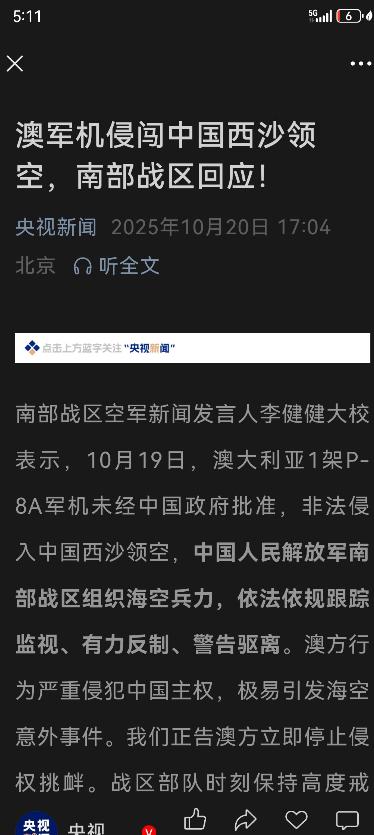 澳大利亚上次来南海,被我们的激光给照了一下,雷达烧毁,飞行员眼睛致盲,当时还反过来说我们威胁他们的飞行安全!这才时隔一年多吧,又是派了一架p-8A跑到咱们西沙领空来撒野。 其实,这所谓的 “激光烧雷达、照瞎飞行员” 根本就是澳方编的瞎话。 咱们解放军用的驱离激光,本质上就跟强光手电筒一个道理,顶多晃得人暂时睁不开眼,提醒他们 “越界了,赶紧走”,哪有那么大威力能烧了雷达?那雷达可是军机上最金贵的电子设备,真要是能轻易烧穿,那得是能打导弹的高能武器,咱们怎么可能随便用在这种常规驱离里? 而且,飞行员的护目镜,都是专门防强光的,就像焊工的防护镜似的,哪能说致盲就致盲?当时咱们南部战区就说得明明白白,是澳机非法闯入,我们依法警告驱离,全程规范得很。澳方就是自己理亏,又想在国际上博同情,才编出这种没影的事儿。 这可不是澳方第一次干这种颠倒黑白的活儿了。之前他们还撕毁了维多利亚州跟中国签的 “一带一路” 协议,嘴上却说 “不针对特定国家”,结果咱们一查,他们审了上千份协议,最后就撤了四项,其中两项全是跟中国有关的。外交部当时就戳穿了他们的谎话,说这明摆着就是针对中国,根本没诚意发展关系。你看,是不是跟南海这事儿一个套路?自己先动手挑衅,被抓住把柄了就造谣抹黑,把自己扮成受害者。 要说澳大利亚为啥老不远万里跑来南海撒野,首先得提它跟美国的那点 “小弟跟大哥” 的关系。这些年美国老想在亚太压制咱们,搞了个 “印太战略”,澳大利亚作为 “五眼联盟” 的成员,又是美英澳三边安全伙伴的一份子,一门心思想给美国表忠心。 就像这次派 P-8A 来,正好赶在美国刚在南海搞完军演之后,这哪是巧合啊?明摆着是帮美国探路,偷偷搜集咱们的军事部署、雷达信号这些情报,给美国递 “投名状”。它心里打的算盘很清楚:帮美国干活,美国就能在安全上罩着它,还能在贸易上给点好处,毕竟澳大利亚在国际上没啥话语权,跟着美国才能刷存在感。 除了讨好美国,南海对澳大利亚自己的经济也牵着不少利益。您可能不知道,澳大利亚的铁矿、煤炭这些出口货物,八成以上都要走南海这条航线,南海简直就是他们的 “海上生命线”。他们总担心咱们把南海的秩序管起来,以后他们的船要经过就得看咱们脸色,所以就跟着美国喊 “自由航行” 的口号,其实就是想搅乱局势,好浑水摸鱼。但他们忘了,咱们从来没拦过正常的商船,这些年南海的航运一直顺顺当当的,反倒是他们的军机天天来捣乱,才真的影响安全。 还有个原因是澳大利亚自己的 “安全幻想”,他们总把南海当成自己的 “前沿缓冲区”。说白了就是觉得,把防线建在别人家门口,自己本土才安全。这种想法其实特别可笑,西沙群岛是中国的固有领土,从唐宋时期的 “千里长沙” 记载,到二战后中国政府正式收复,主权归属从来没争议。 澳大利亚一个远在南半球的国家,硬是把咱们的领海当成他们的 “安全屏障”,这不是没事找事吗?这几年他们跟着美国搞联合军演,派军舰晃悠,其实都是这种错误想法在作祟,觉得跟着美国就能制衡中国,结果反而把自己卷进了没必要的麻烦里。 这次派来的 P-8A 反潜巡逻机也不是善茬,这玩意儿号称 “海上猎手”,专门用来搜集军事情报。跑到咱们西沙领空,就像邻居家的人不经允许闯进你家院子,还拿着望远镜到处张望,换作谁都不能忍。咱们南部战区反应也快,海空力量立马出动,跟踪监视、警告驱离,一套动作下来干脆利落,让它灰溜溜地走了。这其实就是在告诉澳大利亚:别耍小聪明,中国的领空领海可不是想来就来的。 说到底,澳大利亚这一次次挑衅,表面上是针对南海,其实是既想抱美国的大腿,又想保住自己的经济利益,还抱着不切实际的安全幻想。但他们没算明白,这种 “一边赚中国钱,一边捅中国刀” 的事儿根本长不了。而且他们造谣的套路玩多了,国际上谁还会信? 上次激光事件没人当真,这次闯领空也只招来一片批评。最后只会搬起石头砸自己的脚,既伤了跟中国的关系,又没捞到啥好处,真是得不偿失。咱们呢,也早就把话放在这了:主权问题上没商量,再来撒野,照样依法收拾。