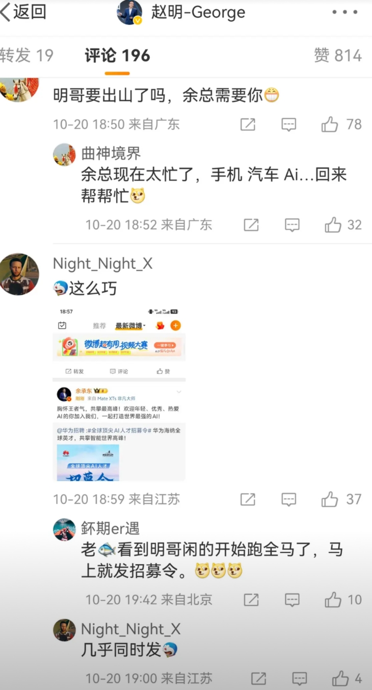 正因如此,网友才对赵明回归华为充满期待:如果他能重新出山回到华为,无论是执掌华为终端,还是负责鸿蒙智行,抑或是拓展AI业务,都能为余承东分担不小的压力,进而推动华为终端、智选车、AI等业务迈向更高台阶。