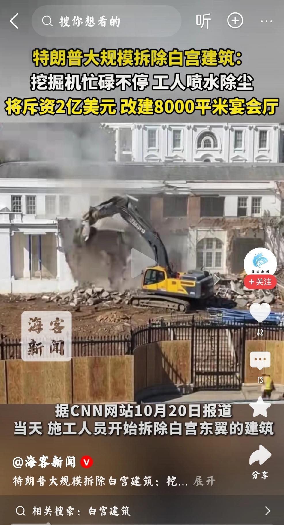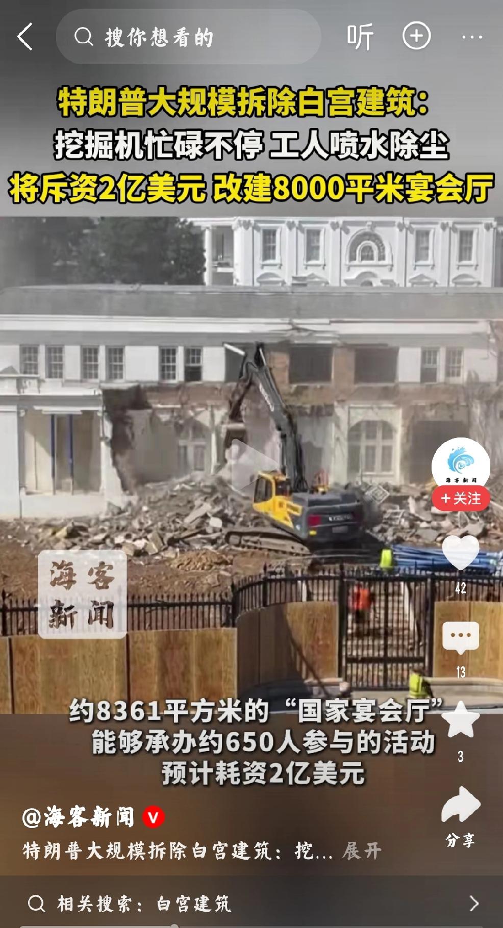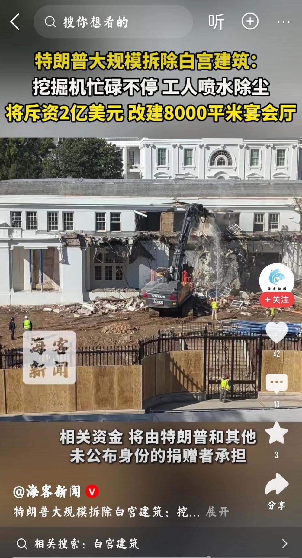 特朗普政府在干什么? 个人观点:美国民众大规模示威游行的时候,特朗普政府在做什么? 一,特朗普在发AI视频,飞机喷物,蓄意挑衅。 二,特朗普政府要员,正在计划购买豪华飞机。 三,特朗普在拆白宫,准备建豪华餐厅。 特朗普政府的荒唐秀,还在继续。