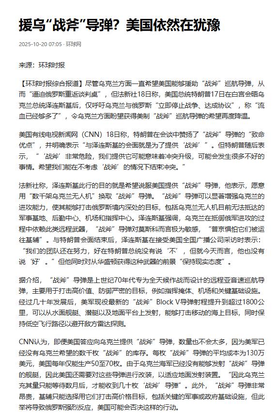 10月20日,美国副总统万斯表示,美国总统特朗普尚未决定向乌克兰提供“战斧”导弹,万斯还强调特朗普的考虑是要首先保证美国自己的安全,为美国保留关键的武器系统。 这事儿说来挺有意思。 乌克兰总统泽连斯基大老远跑到白宫,就为了要"战斧"导弹。 这种导弹能打1600公里远,乌军指望用它把俄罗斯逼回谈判桌。 可特朗普直接说了"不",至少现在不行。 为啥?咱们得从导弹、谈判、博弈三个维度慢慢拆解。 这种射程超过1600公里的巡航导弹,对乌克兰来说简直是“战略核武器”——有了它就能直接威胁俄罗斯本土的军事基地、炼油厂甚至莫斯科。 但美国的态度却像在玩跷跷板:CNN报道称特朗普一方面承认“战斧”的致命性,另一方面又担心“冲突升级”。 这里面有两个现实难题:一是美国库存紧张,每年仅生产50-70枚,给乌克兰几十枚就可能影响自身战略储备;二是乌克兰缺乏发射平台,需要改装地面装置,最快也要几个月才能形成战斗力。 更关键的是,“战斧”的GPS制导系统高度依赖美国情报支持,乌克兰如果没有美军直接参与,根本无法精准打击目标。 这就像给了孩子一把狙击枪,却不教他怎么瞄准,反而可能让持枪者陷入更大危险。 再看美俄之间的暗战。 就在泽连斯基访美前一天,特朗普和普京通了两个半小时电话,双方不仅约定在匈牙利布达佩斯会晤,还讨论了结束俄乌冲突的“路线图”。 普京明确表示,“战斧”导弹不会改变战场局势,反而会损害俄美关系。 这种表态背后是俄罗斯的底气:俄军在前线仍掌握战略主动权,且拥有S-400等先进防空系统,对“战斧”有较强拦截能力。 更微妙的是,特朗普政府似乎在调整策略——从之前支持乌克兰“收复失地”转向推动双方“就地停火”,甚至暗示乌克兰可能需要接受领土让步。 这种转变与特朗普的全球战略有关:他更倾向于收缩海外投入,集中精力应对亚太挑战,而俄乌冲突长期化显然不符合这一目标。 最后是这场博弈中的多方角力。 乌克兰看似是主角,实则处于被动地位。 泽连斯基虽然反复强调“战斧”的重要性,但美国国会对乌军援的分歧越来越大,共和党甚至要求削减拨款。 欧洲方面则陷入两难:一方面担心俄罗斯的核威慑,另一方面又不愿完全追随美国。 匈牙利总理欧尔班就直言,俄罗斯的常规军力虽弱,但核力量仍是北约的“达摩克利斯之剑”。 这种复杂的地缘政治格局,让“战斧”导弹成了一枚“政治导弹”——它的命运不仅取决于战场需求,更取决于大国间的战略权衡。 现在最值得玩味的是特朗普的“极限施压”策略。 他一方面吊着乌克兰的胃口,另一方面又和俄罗斯保持对话,试图通过这种“双轨战术”迫使普京让步。 但这种玩火行为存在巨大风险:如果俄罗斯误判美国意图,可能引发核威慑升级;如果乌克兰得不到预期武器,可能转而寻求其他极端手段。 更关键的是,美国的盟友体系正在出现裂痕——欧洲对特朗普的“美国优先”政策越来越不满,而亚太国家则在观察美国的战略定力。 这场大戏的结局可能有两种:一种是美俄达成秘密协议,乌克兰被迫接受停火条件;另一种是美国在压力下有限度提供“战斧”,但附加严格使用限制。 无论哪种结果,乌克兰都很难成为真正的赢家。 毕竟在大国博弈中,小国的命运往往由别人的棋盘决定。 你认为特朗普最终会向乌克兰提供“战斧”导弹吗?欢迎在评论区留下你的判断,咱们一起见证历史的走向。