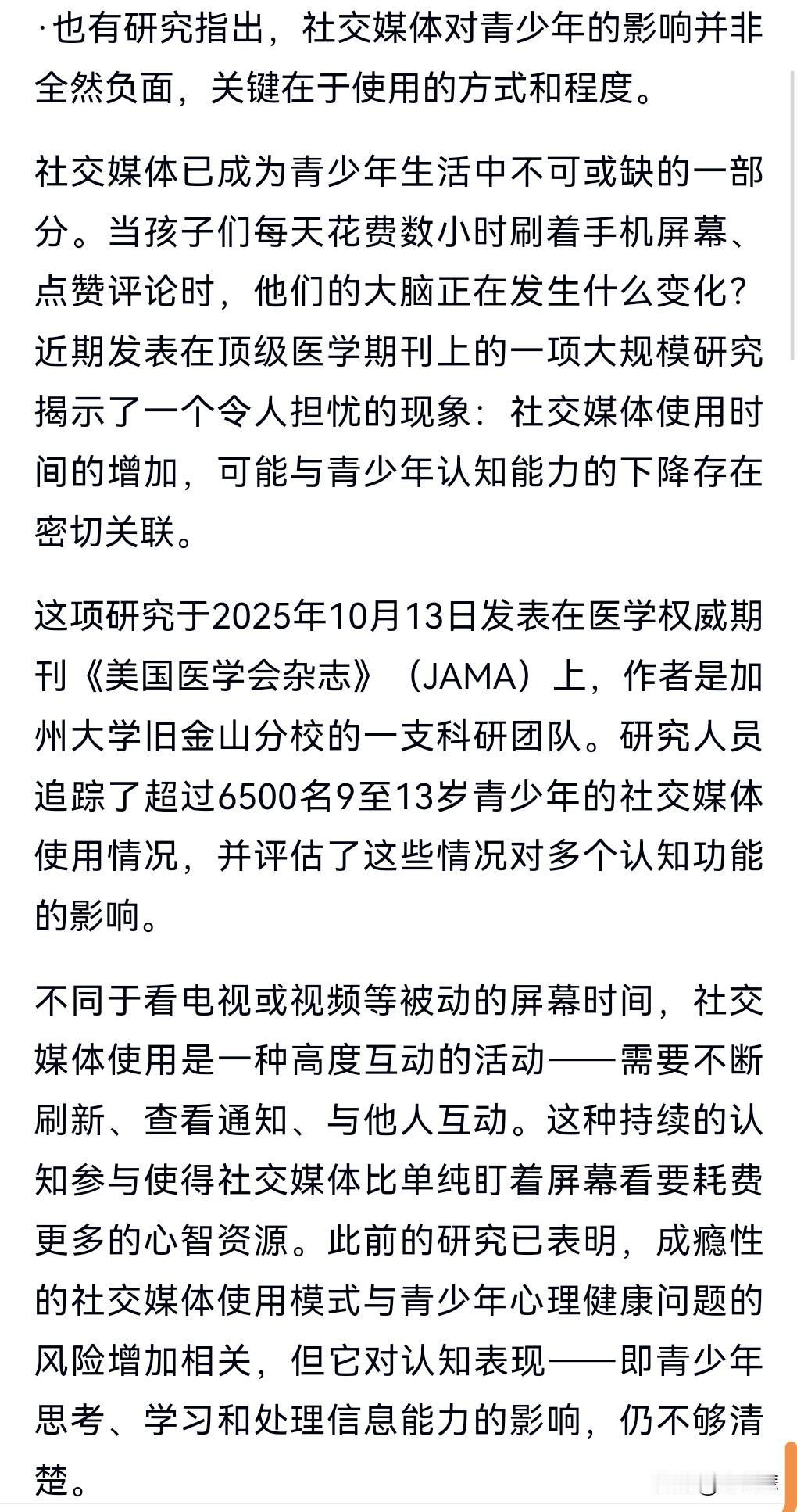真的假的? 这还是有点让人担心的。 10月21日在网上看到这么个文章。 文章称每天刷手机,青少年认知能力显著下降。 有一说一,手机确实要少玩。 少看一些没有营养的东西。 多听一些有价值的东西。 有的时候听就行了,用不着看。 因为这个世界是有时间成本的。 每天刷手机 青少年认知能力显著下降