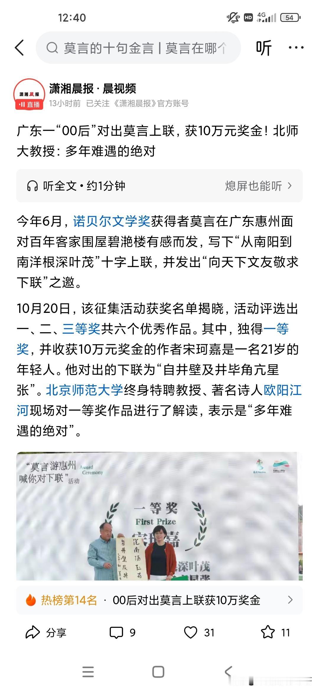 最近一名零零后的小朋友对出了莫言的上联绝对,然后获取了10万元左右的奖金,非常了