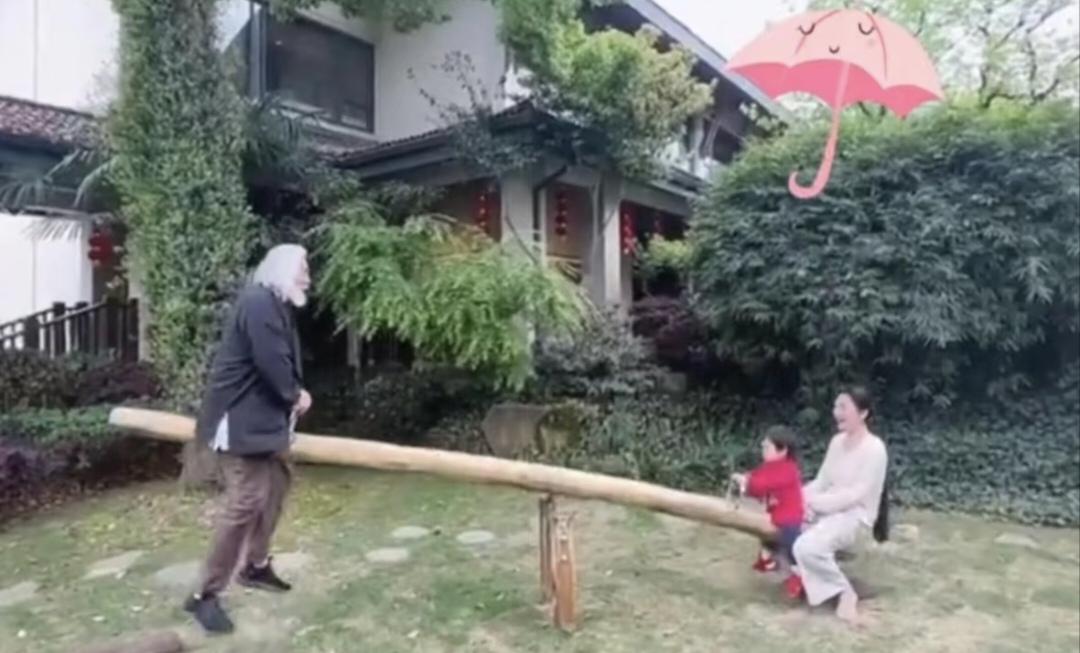 张纪中虽然大妻子杜星霖31岁,可是他们一家在一起的时候画面既和谐又温馨:张导和妻子、孩子们一起植树。老张当然是主力军了,刨坑、填坑任务做得一丝不苟。大点孩子或玩耍,或帮忙。杜星霖则怀抱着小龙珠一旁陪伴着,小龙珠津津有味地看着爸爸植树。真是幸福一家人! 第二幅图更是引人注目:别看张纪中74岁了,依然是童心悠悠,陪着杜星霖母女玩跷跷板。即使头发全白了,爱妻爱女之心犹在,只要妻儿高兴,张导就会陪着妻儿玩耍。 张纪中为了这个家地付出着,杜星霖也是无私地回报。年龄四十多岁时,还剖腹产,产下爱女小龙珠。所以说,婚姻长久,年龄不是问题,主要是得互相付出。