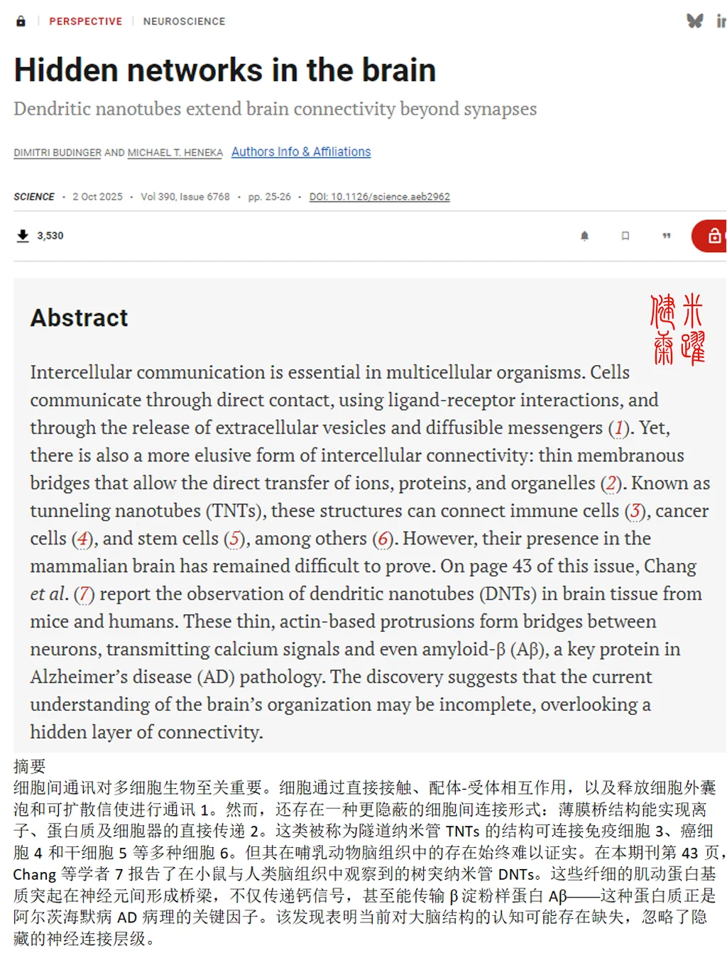 长久以来,神经科学家们一直认为神经元之间的交流主要依赖于突触这一经典结构。然而,近日Science期刊上的一项重磅研究却颠覆了这一传统认知,揭示了大脑中一种全新的通信方式--树突纳米管(DNTs)网络。