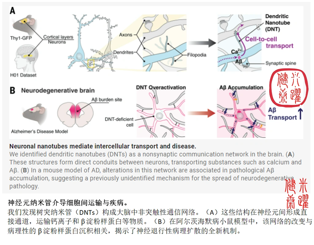研究发现,DNTs不仅能够传输钙离子等小分子物质,还能成为致病蛋白如β-淀粉样蛋白(Aβ)的传播通道。在阿尔茨海默病这一神经退行性疾病中,Aβ的积累和传播是疾病进展的关键因素。而DNTs的存在,则为Aβ在神经元间的快速传播提供了可能,从而加速了疾病的恶化。