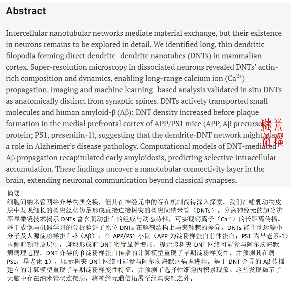 这项研究的意义远不止于此。它改写了神经科学的教科书,让我们重新审视大脑中的通信机制。DNTs网络的发现,不仅揭示了神经元间复杂而精细的连接方式,也为大脑连接性、细胞间通信以及神经疾病基本过程的研究开辟了全新的途径。