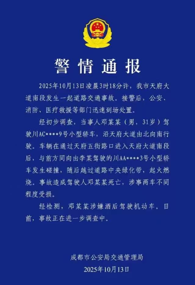 2025年10月13日凌晨3时18分许,成都市天府大道南段发生一起道路交通事故。