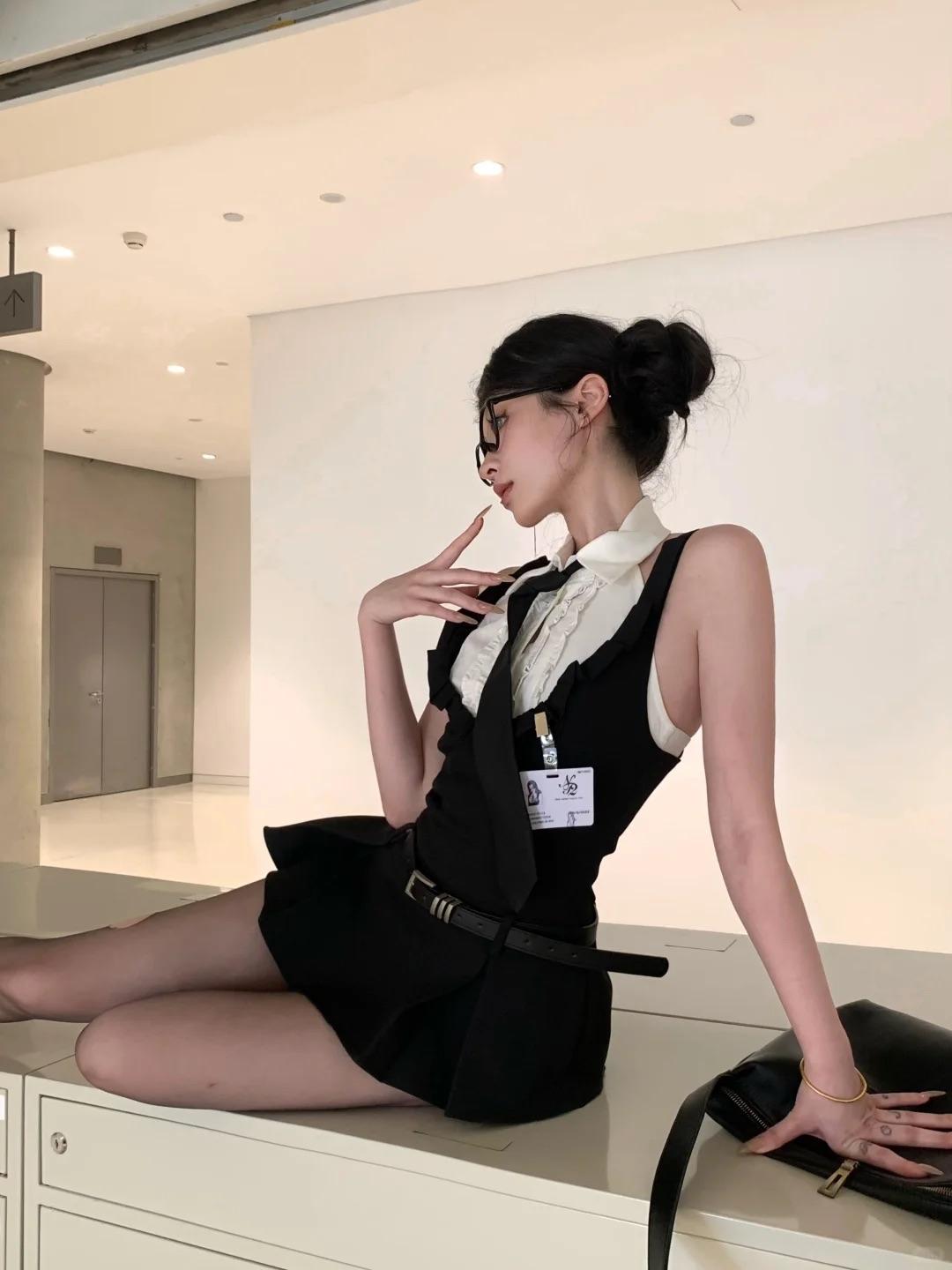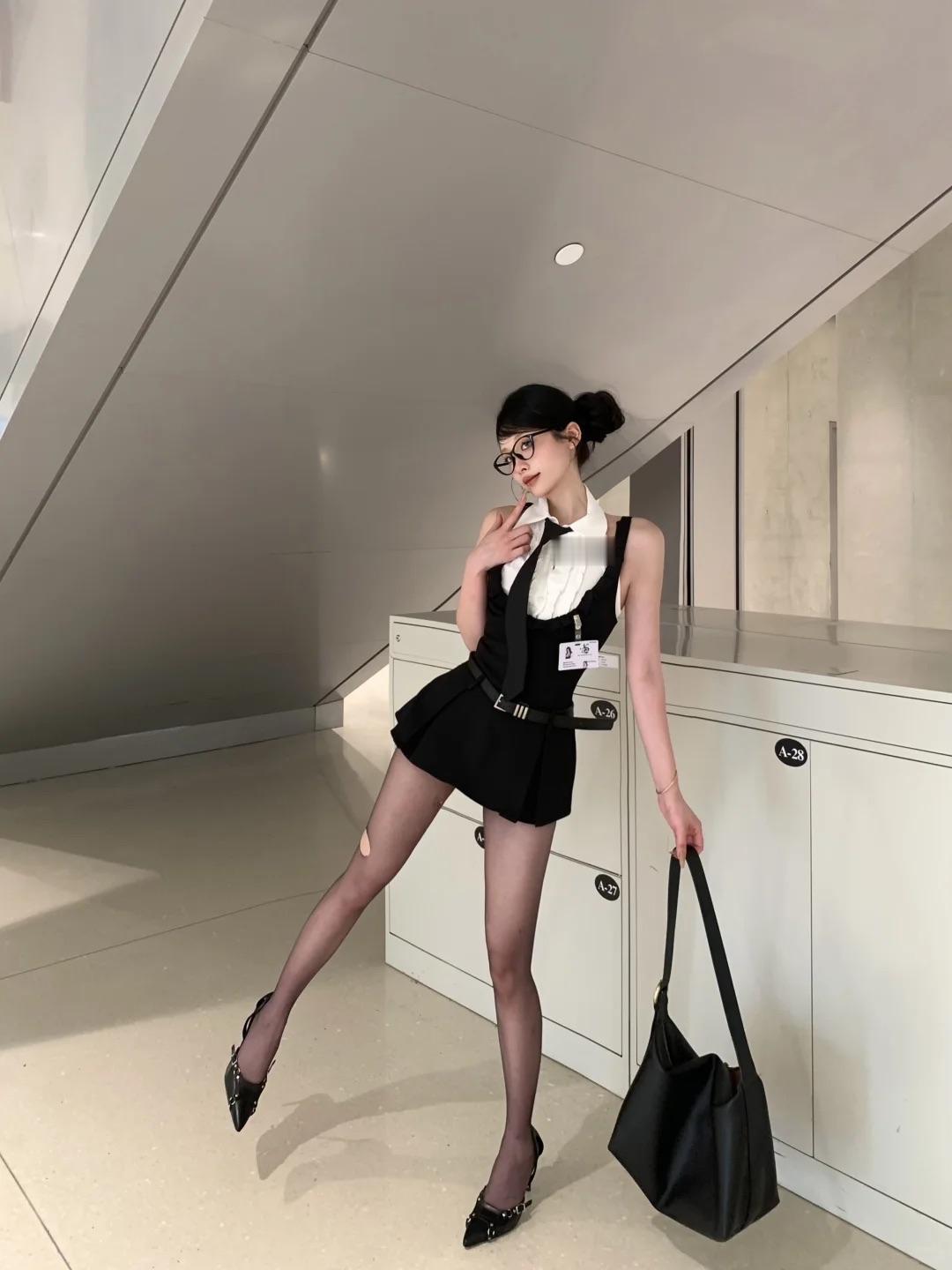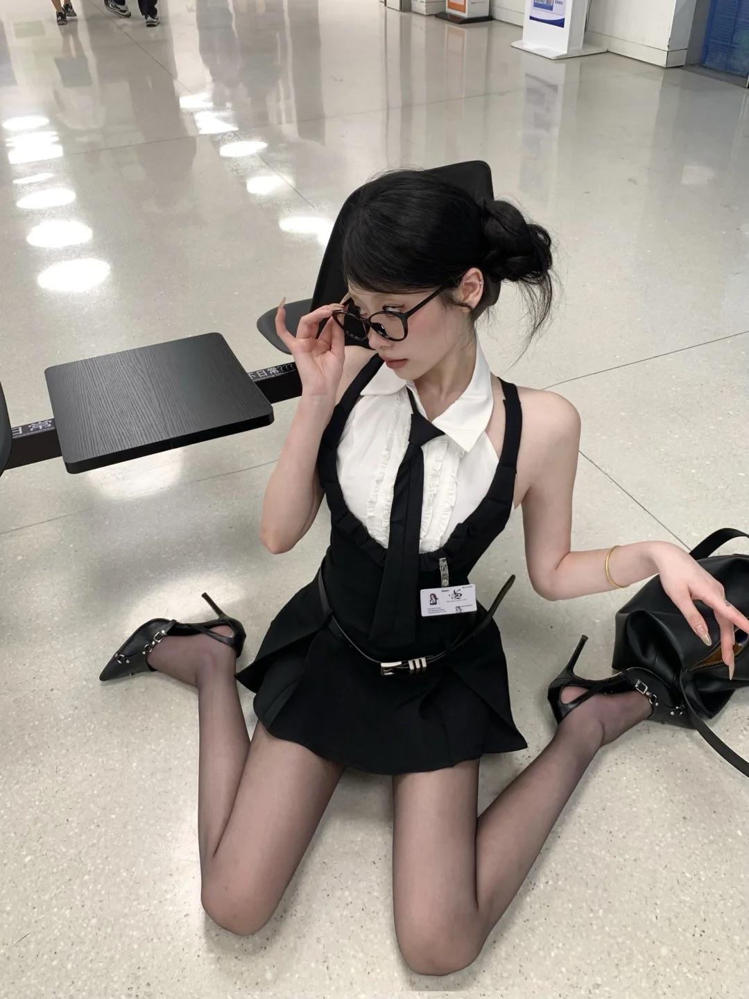 职场轻熟风写真|黑裙领带+工牌眼镜,妹妹的纯欲氛围感直接拉满~