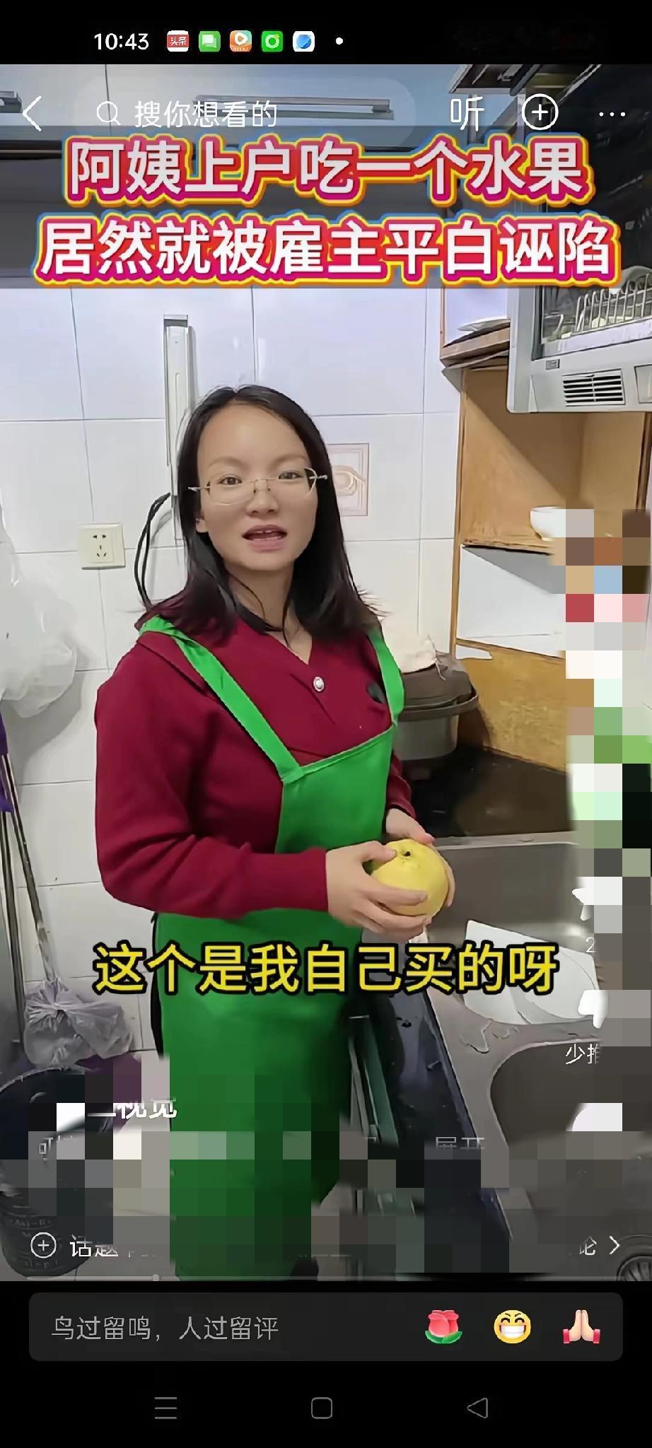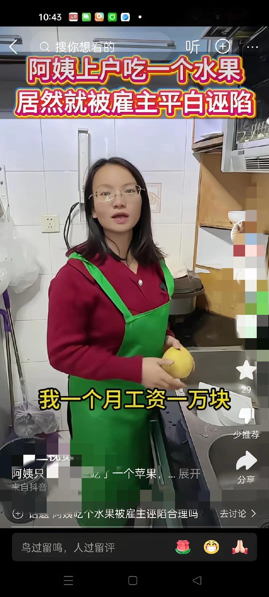 这波反转太解气了! 保姆洗梨吃竟被女主人当场呵斥, 直言“这是给宝宝买的进口梨,你舍得买吗”,言语里的轻蔑藏都藏不住。谁料保姆直接硬核回怼:“我月薪1万存款六位数,别说十几块的梨,一百块的也吃得起!”说完当场辞职,只留女主人气得直跺脚。 其实这场闹剧的核心,从来不是一个梨的价值,而是职业偏见在作祟。在很多人眼里,总觉得保姆、保洁这类职业“低人一等”,却忘了职业无高低,体面从来都是自己挣来的。 女主人用收入给人贴标签的样子,反而暴露了自己的格局狭隘。尊重是相互的,不管对方从事什么职业,平等相待才是最基本的素养。 你遇到过职业偏见的情况吗?来评论区说说你的看法~ 职业无高低