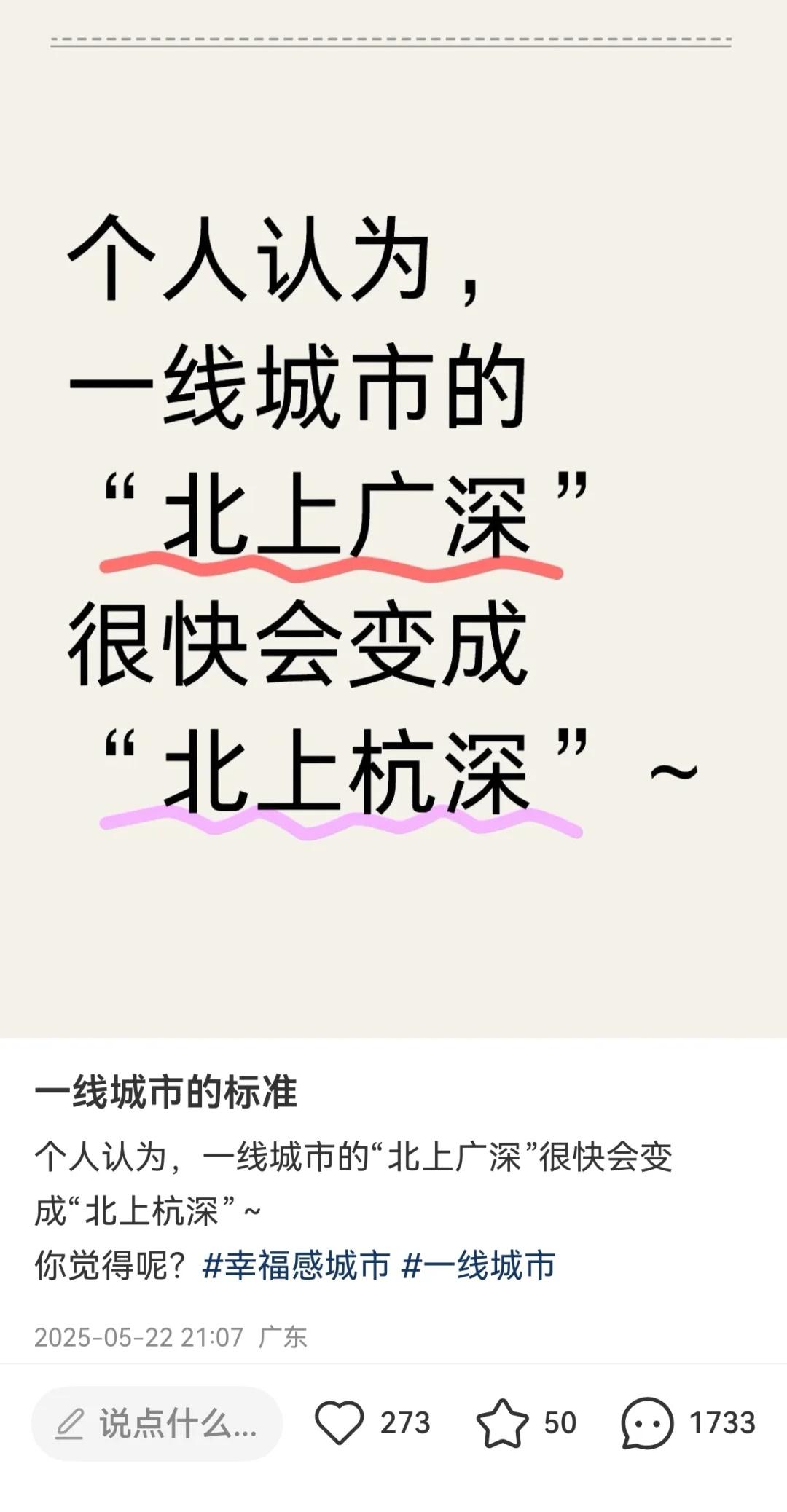 果然,还得是北上杭深😆 被喷了两个月, 终于有官方证明了 之前去广州出差,有感而发,发了一篇,觉得相比于杭州的不断进步,广州好像落后了~ 其实完全是随手笔记,没想到引发了巨大讨论,一群人说我是地域黑,还有说我是为了起号才... 事实证明,官方的数据是雪亮的[惊喜] 好好好,我还是想说,杭州、广州都不错,双州一起加油吧[爱慕] 一线城市 广州