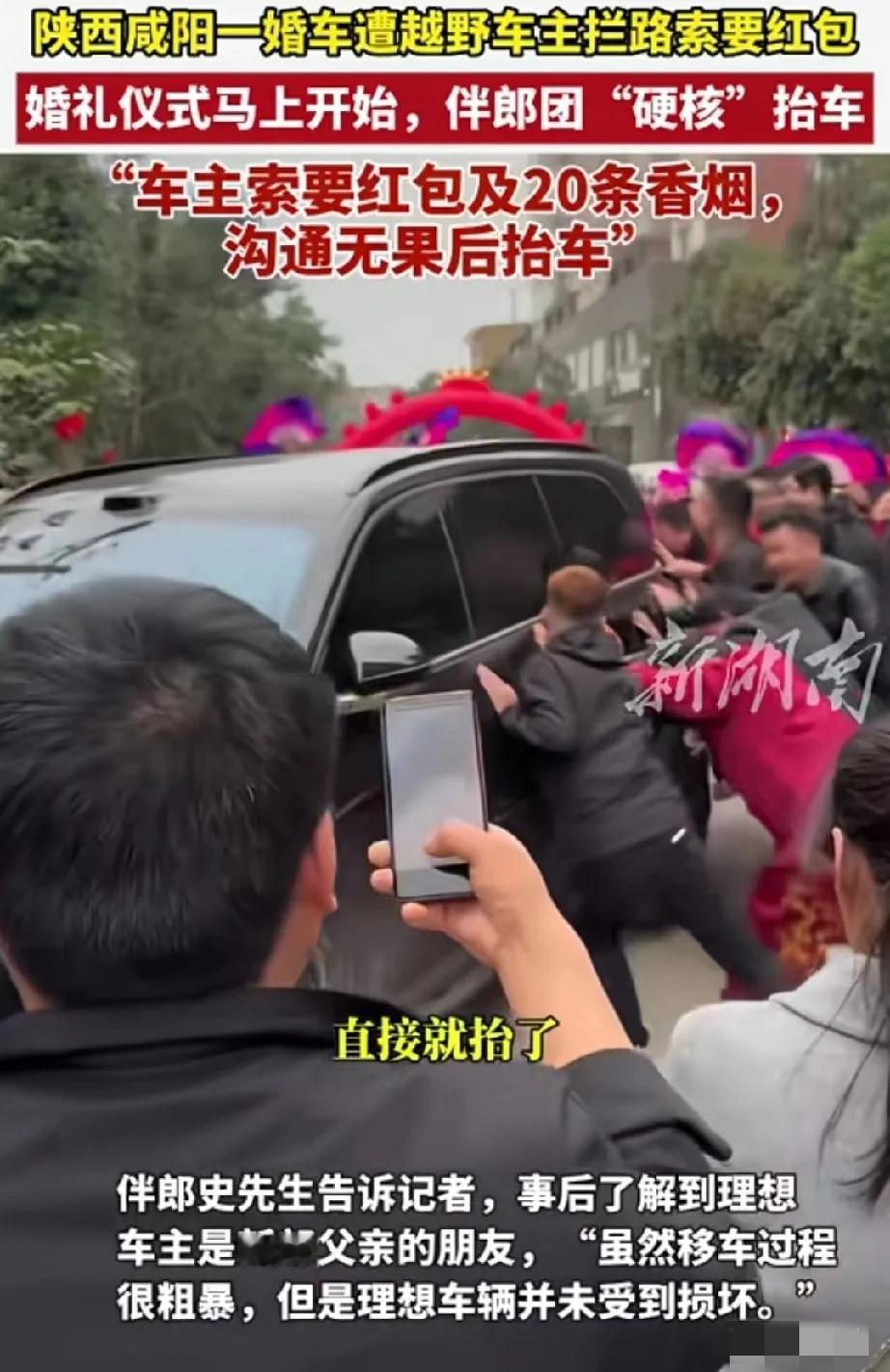 不能惯着!陕西咸阳一婚车遭遇越野车主挡路索要红包以及20条中华,双方协商无果后,伴郎团直接硬核抬车。 新人急着赶婚礼,好说歹说协商不通,伴郎团直接硬核上阵抬车,总算让婚车开了过去,万幸车子没受损。可谁能想到,事后一打听,这拦路的车主居然是新郎父亲的朋友!真是应了那句“大水冲了龙王庙”,熟人这么干,比外人还让人膈应。 婚闹本是图个热闹,可把“闹”变成“抢”,就彻底变了味。借着别人的喜事漫天要价,不仅败了新人的兴致,更是丢了自己的体面,哪怕是熟人,这么一闹也把情分闹没了。 大家身边遇到过这种变味的婚闹吗?要是你结婚遇上有人这么拦路要东西,你会怎么处理?