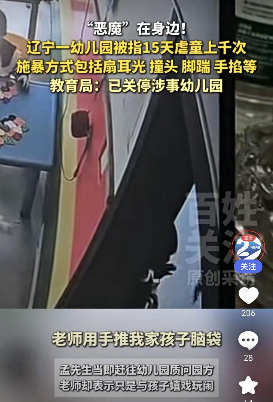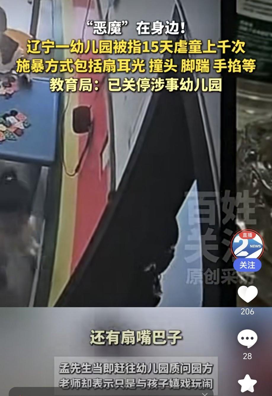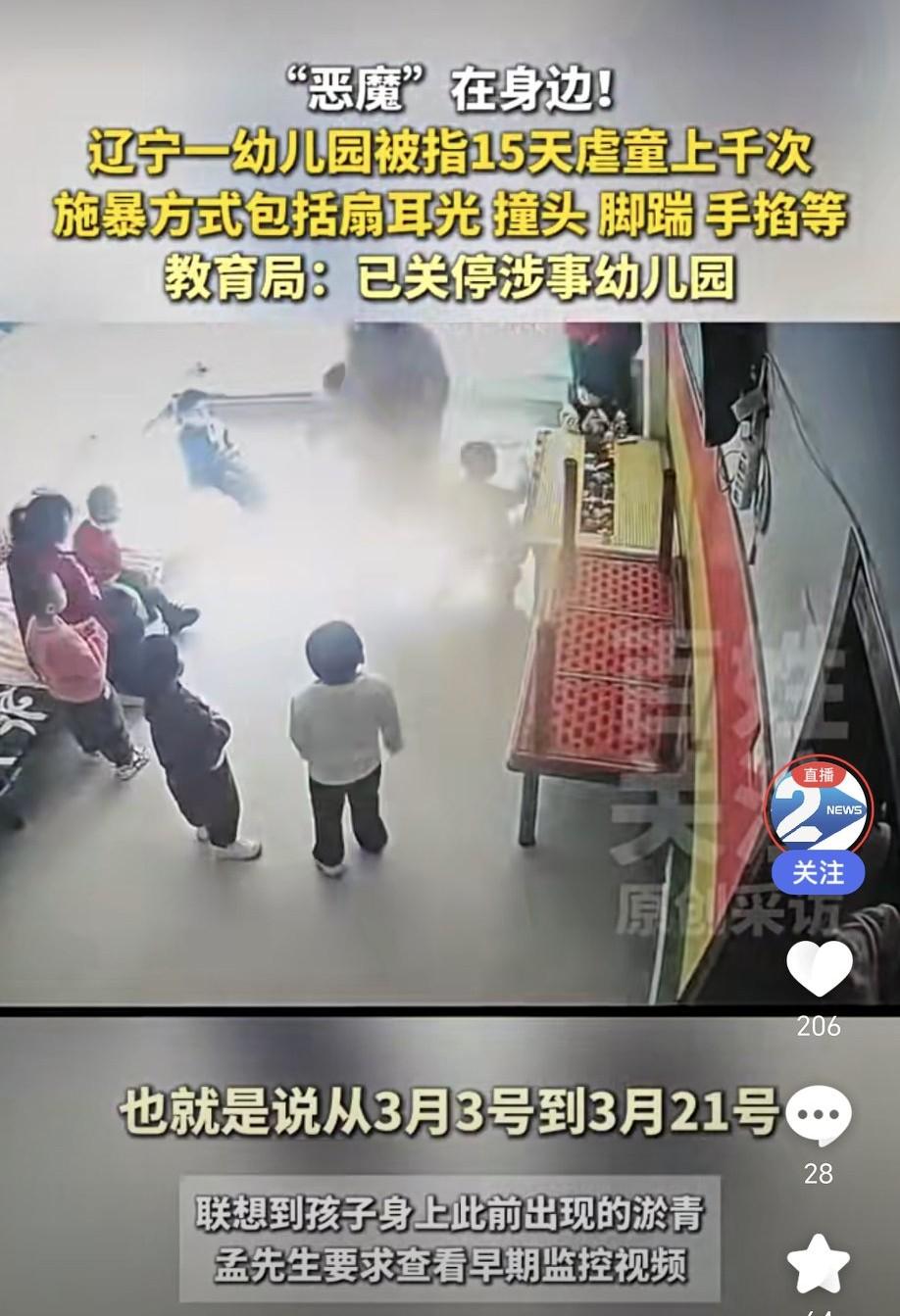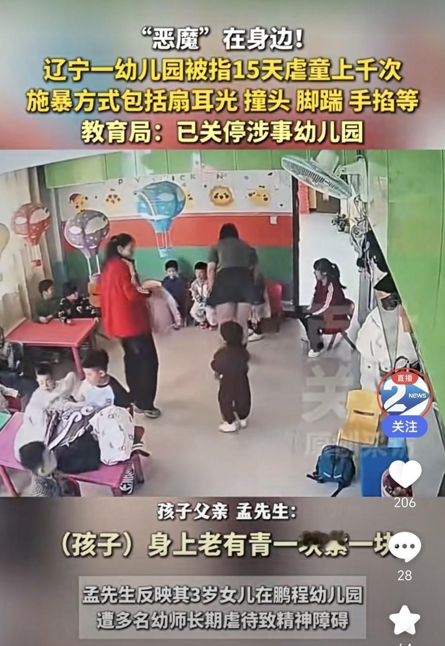 孟先生3岁的女儿在辽宁盘锦鹏程幼儿园上学。从去年10月孩子身上就常出现淤青,今年3月21日看监控,竟看到老师拽着孩子推头撞墙、扇嘴巴。往前查监控,3月3日到21日,自家孩子和其他孩子被打近千次,还有脚踢、掐脖子等恶劣行为。 盘山县教育局5月15日关停了幼儿园,6月对法人永久禁入民办学校机构负责人行列,涉事老师也被开除。 A网友:光开除有什么用,不应该拘留几个月,终身不让当幼师吗?一家就一个独苗,收集到证据报警正式起诉,追究刑事责任。 B网友:对涉事幼儿园老师,不应该只是开除处理,这是虐童、故意伤害。应该从校长到老师全都追加刑事责任。这样才有威慑力! C网友:经过此事,本来活泼可爱、开朗乐观的孩子,会留下多大的心理阴影?为什么这样的事屡见不鲜?出事了,最多幼儿园关停,相关人员拘留,还是处罚的太轻了。 对那些受伤害的孩子和家长来说,伤害已经造成。孩子那么小,遇到这样的事,不知道心理得留下多大阴影,对孩子的影响也将会伴随其一生。真希望相关部门能加强监管,别再让这种事发生!
