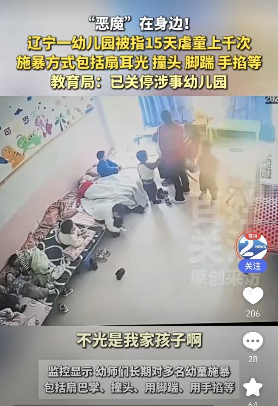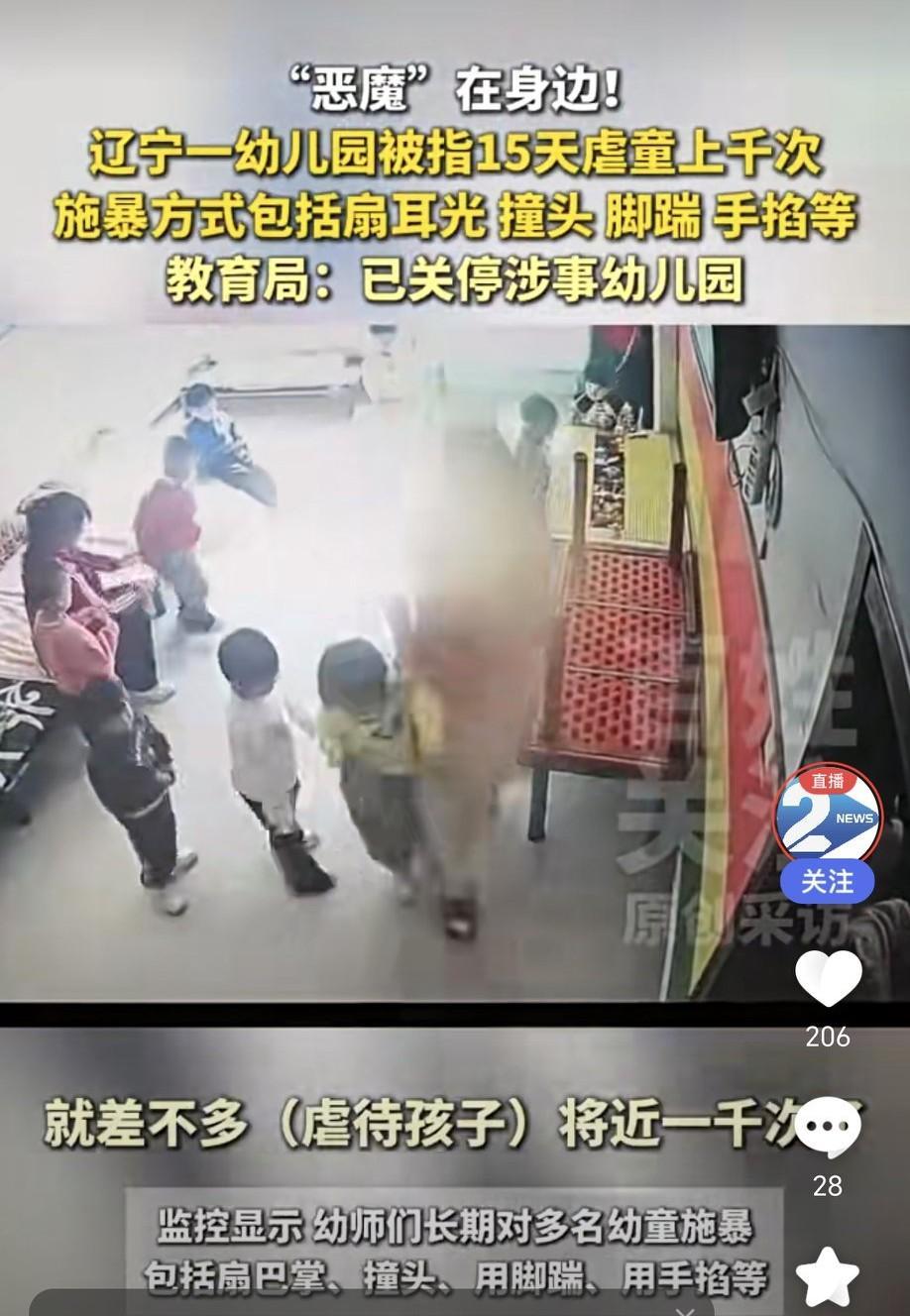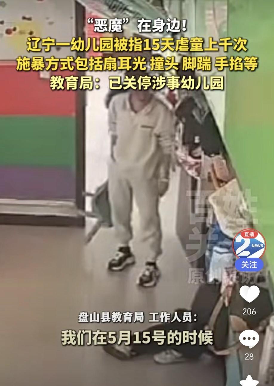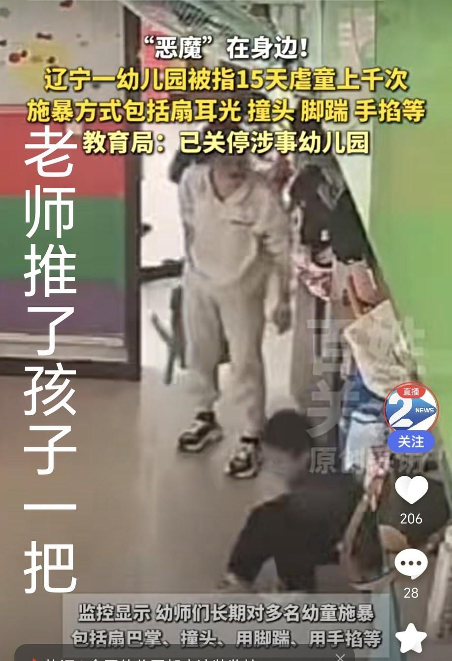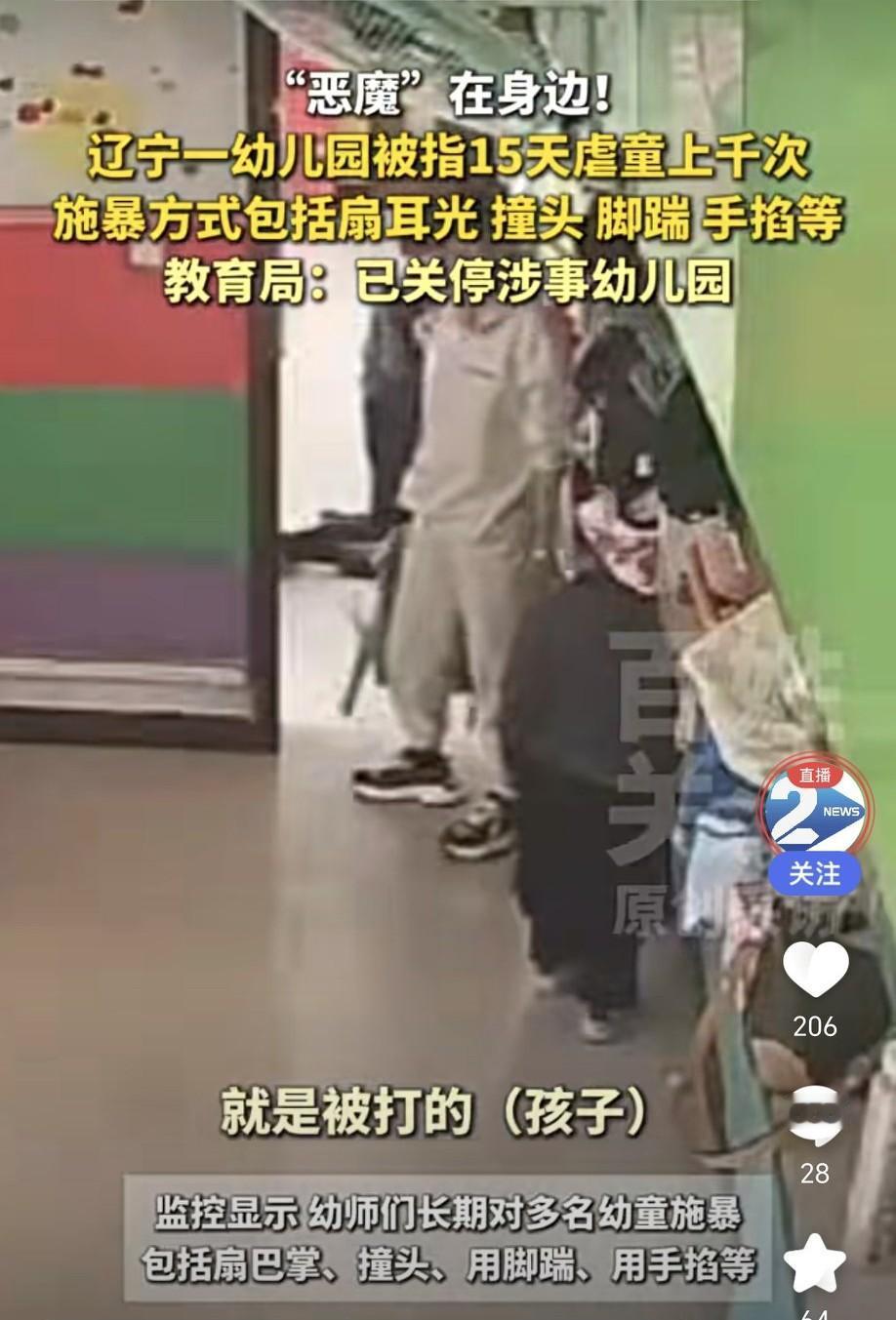 孟先生3岁的女儿在辽宁盘锦鹏程幼儿园上学。从去年10月孩子身上就常出现淤青,今年3月21日看监控,竟看到老师拽着孩子推头撞墙、扇嘴巴。往前查监控,3月3日到21日,自家孩子和其他孩子被打近千次,还有脚踢、掐脖子等恶劣行为。 盘山县教育局5月15日关停了幼儿园,6月对法人永久禁入民办学校机构负责人行列,涉事老师也被开除。 A网友:光开除有什么用,不应该拘留几个月,终身不让当幼师吗?一家就一个独苗,收集到证据报警正式起诉,追究刑事责任。 B网友:对涉事幼儿园老师,不应该只是开除处理,这是虐童、故意伤害。应该从校长到老师全都追加刑事责任。这样才有威慑力! C网友:经过此事,本来活泼可爱、开朗乐观的孩子,会留下多大的心理阴影?为什么这样的事屡见不鲜?出事了,最多幼儿园关停,相关人员拘留,还是处罚的太轻了。 对那些受伤害的孩子和家长来说,伤害已经造成。孩子那么小,遇到这样的事,不知道心理得留下多大阴影,对孩子的影响也将会伴随其一生。真希望相关部门能加强监管,别再让这种事发生!