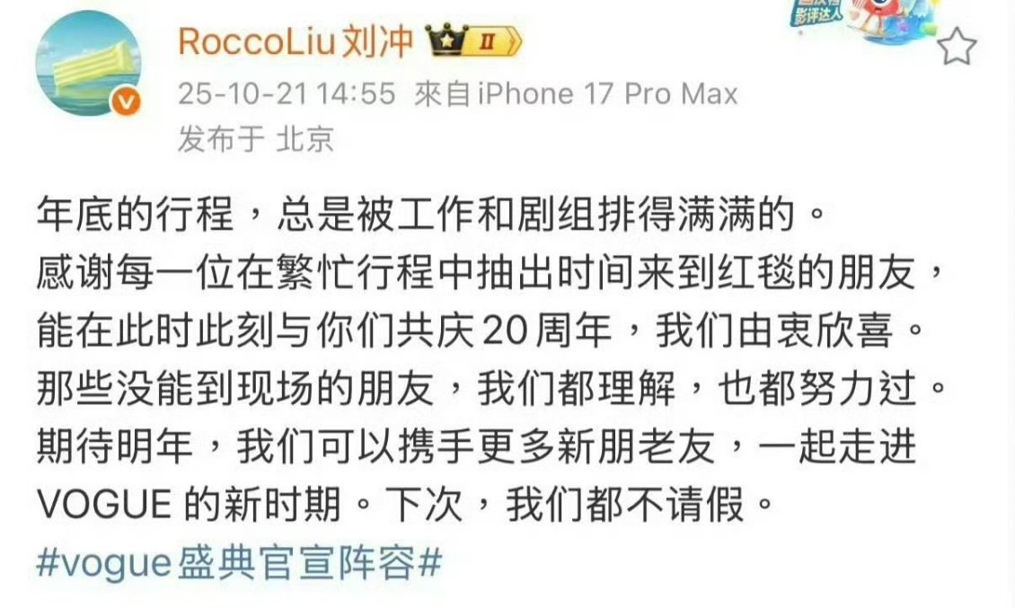 不瞒着大家了,刘冲说的是我,这次因为一些工作原因没办法出席VOGUE,辜负了大家的期待,跟大家道个歉,明年争取不请假[祈祷] 刘冲回应VOGUE阵容