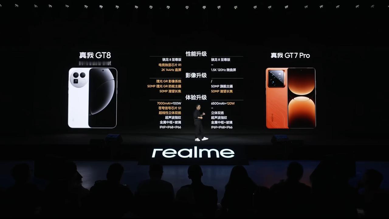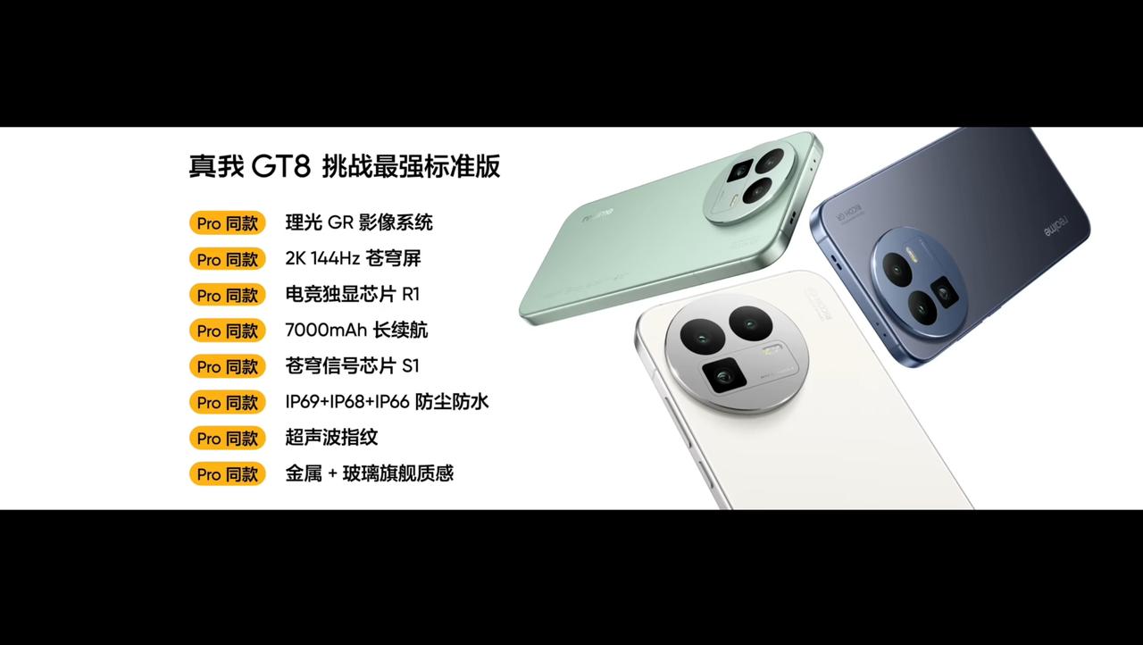 真我 GT8 发布,12+256GB 售价 2899 元、16+256GB 售价 3199 元、12+512GB 售价 3399 元、16+512GB 售价 3599 元、16GB+1TB 售价 4099 元,价格比上代贵 300,但是产品力全面升级了。 - 芯片:骁龙 8 至尊版处理器,LPDDR5X 内存,UFS 4.1 闪存,7000mm² 超覆盖冷锋 VC 散热,电竞独显芯片 R1,首发苍穹信号芯片 S1,GT 性能引擎 3.0; - 屏幕:6.79 英寸 3136×1440 京东方 Q10+ OLED 直屏,144Hz 刷新率(LTPS),全屏最高亮度 2000nit、20% 窗口激发亮度 4000nit,局部峰值亮度 7000nit,硬件级 1nit 护眼(软件 11 月 OTA);圆偏振自然光护眼、全亮度类 DC 调光,支持 10bit 色深,超声波指纹识别,360Hz 四指触控采样率,3200Hz 瞬时触控采样率,首发游戏真彩护眼; - 相机:前置 16MP,后置 50MP 主摄(1/1.56",OIS)+ 8MP 超广角 + 50MP 潜望长焦(三星 S5KJN1,1/2.76",OIS),主摄理光联名,通过理光防眩光认证; - 续航:7000mAh 泰坦电池(硅含量 15%),100W 快充,10W 反向充电,兼容 50W PPS、44W UFCS、36W PD/QC; - 其他:玻璃版厚 8.2mm、重 214g,素皮版厚 8.3mm、重 209g,提供怀特(玻璃)、纳维(玻璃)、格林(类纸再生皮革)3 款配色,IP69 防尘防水,NFC、红外遥控,3D 超声波指纹识别,IP66 & IP68 & IP69 防尘防水,搭载基于 Android 16 的 realme UI 7.0 系统。