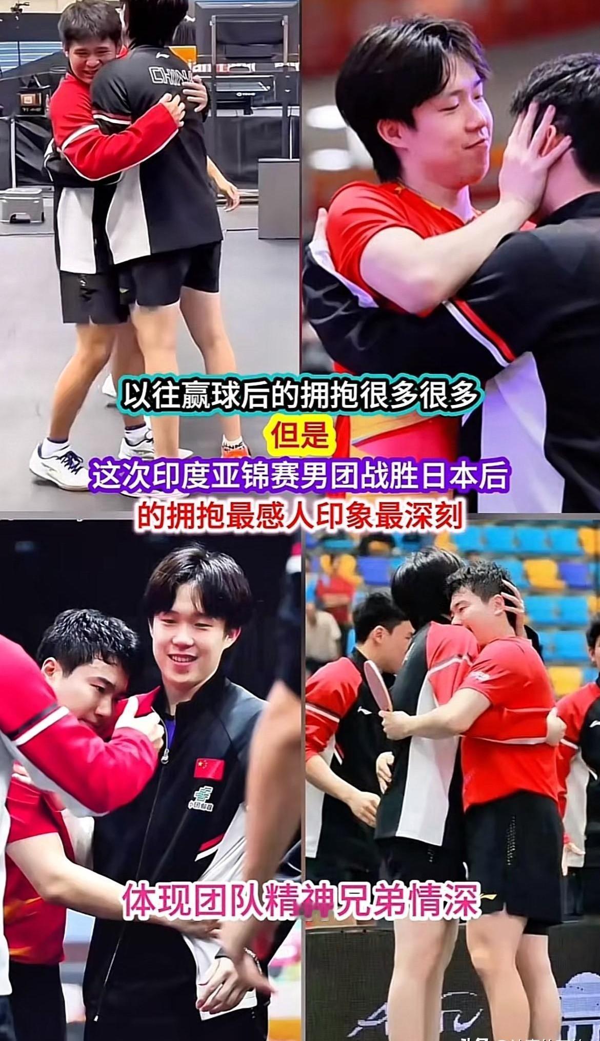 赢球那一刻,全场都在沸腾,我的眼睛却定格在了王楚钦身上。 他明明是体力透支最严重的那个人,却成了全队的情绪支撑点。 弟弟哭着扑向他,哥哥也哭着扑向他,可谁来抱抱这个也才25岁的大男孩呢? 小将林诗栋,背负的压力太大了,比赛一结束就绷不住了,直接冲过来把头埋在王楚钦的怀里大哭。王楚钦没有多余的话,只是轻轻拍着他的背,像一个真正的大哥,无声地传递着“有我呢”的力量。 更让人动容的,是梁靖崑。作为队里的哥哥,“大胖”也彻底释放了,紧紧抱着王楚钦,把所有的紧张和后怕都宣泄了出来。那一刻的王楚钦,已经超越了年龄,他就是那个能让队友安心的存在。 很多人可能都忘了,以前那个输了球就爱掉眼泪的小孩,也是王楚钦。他太明白那种害怕辜负所有人期待的巨大压力了。因为自己也曾站在悬崖边上,所以他最清楚队友此刻需要的是一个坚实的依靠,而不是大道理。 从需要别人安慰的孩子,到成为安慰所有人的顶梁柱,这条路他走得真不容易。 他用自己的肩膀,扛起了属于他的责任。 赢球靠的是技术,而这种担当,是格局。