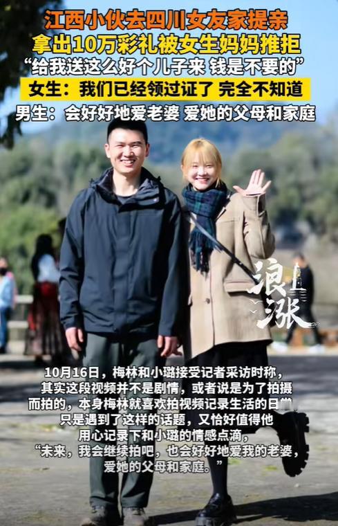 “打得措手不及”!近日,江西小伙和父母凑够十万块钱前往四川女友家提亲,见面后双方都有点紧张,聊天时并没有提及有关提亲的事宜。直到午饭后小伙妈妈起身前往房间,出来时拿着一包钱,微笑着来到女孩妈妈跟前,女孩妈妈顿时明白了啥意思,接下来发生了的事更不可思议,且将男方一家“打得措手不及”! “亲家,这钱您拿着,这是我们的一点心意。”这是双方家长第一次见面,梅林和小璐在此之前从未谈过彩礼的事情,他们都没想到,梅林的父母会这样做,但他们更没想到的是,小璐的母亲竟然轻轻推开了那个沉重的布包,笑着说:“我不是卖女儿,你们给我一个好儿子比啥都强。” 梅林是个江西的90后退役小伙,小璐是个四川姑娘。他们是2023年在网络上认识的,当时梅林正处于人生的低谷,是小璐“雪中送炭”,邀请他到乐山一起创业。从相识到相知,两个年轻人渐渐走到了一起。 当感情成熟,谈婚论嫁提上日程时,梅林的父母内心是忐忑的。他们知道,在江西老家,彩礼是婚姻的一道重要程序,十万块钱只是一个普通的数字。但他们都是朴实的农民,一辈子在地里干活,十万块钱对他们来说,已经是多年的积蓄了。 “你说,小璐家那边会不会嫌少啊?”去四川前,梅林的父亲曾这样问妻子。 母亲沉默了一会儿,随后坚定地说:“咱们尽力了,娶媳妇该有的礼数不能少,这是对女方的尊重。” 就这样,梅林的父母带着儿子和十万元现金,踏上了前往四川的列车。一路上,父母话都不多,都在担心女方家长会不会觉得彩礼太少?会不会提出其他要求? 到达小璐家后,双方家长初次见面的气氛虽然很友好却难掩紧张。午饭时,大家聊着家常,聊着两个孩子的未来,但谁都没有主动提及彩礼这个敏感的话题。 梅林的母亲却在心里反复排练着该如何开口,如何在不让对方感到被冒犯的前提下,表达自家的诚意。 午饭后,眼看着聚会即将结束,梅林的母亲知道不能再等了。她起身走进房间,拿出那个早已准备好的布包。接下来发生的便是文章开头的那一幕。 在小璐的父母看来,孩子们还年轻,他们可以自己去奋斗,而且,对于一段婚姻来说,彩礼并不是绝对的保障,一个踏实、可靠、负责的女婿才是最重要的。而且,那是男方一辈子的积蓄,他们不能因为嫁女儿,就让亲家把养老钱都掏出来。 要知道,现如今,彩礼常常成为婚姻路上的绊脚石。多少原本相爱的年轻人,因为彩礼问题而分道扬镳;多少家庭因为彩礼而心生芥蒂。 也正因如此,这一幕发到网上后,才有那么多网友称赞女方母亲通情达理。 有人评论说:“这才是真正的嫁女儿,不是卖女儿。”也有人感慨:“这样的丈母娘太难得了,小伙子和他的父母一定都是很好的人,才能得到这样的尊重和体谅。” 面对突如其来的关注,梅林和小璐在接受封面新闻采访时表示,视频并非设计的剧情,而是他日常生活的真实记录。他表示,自己和小璐已经领了证,两人正在乐山经营着自己的小生意,生活虽然平凡但很幸福。 小璐也坦言,她选择梅林,看中的是他的责任心和上进心,而不是他家里能拿出多少彩礼。在她看来,两个人一起奋斗来的,才是真正属于自己的。 信源: 封面新闻——江西小伙带爸妈到四川女友家提亲,拿出10万彩礼被女生妈妈拒收 浪涨新闻——江西小伙去四川女友家提亲拿出10万彩礼被女生妈妈推拒“给我送这么好个儿子来钱是不要的” 文│一阳 编辑│史叔